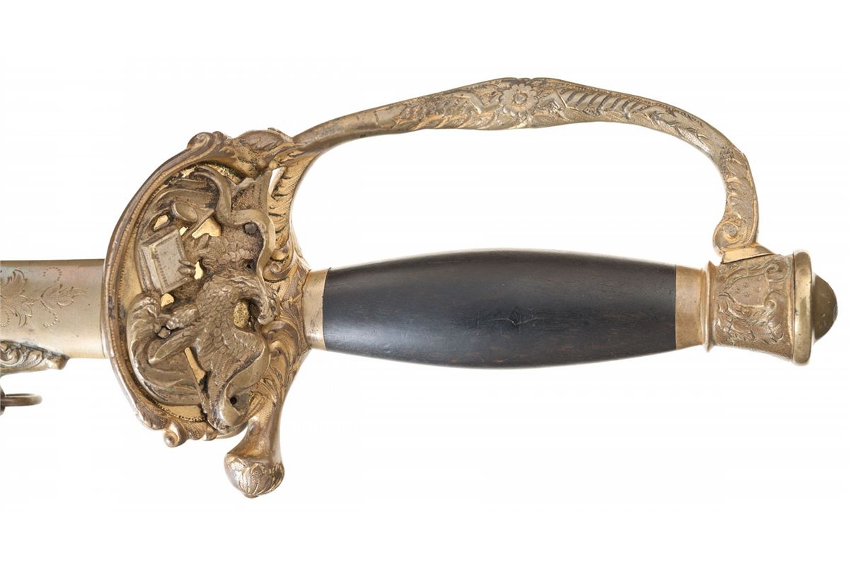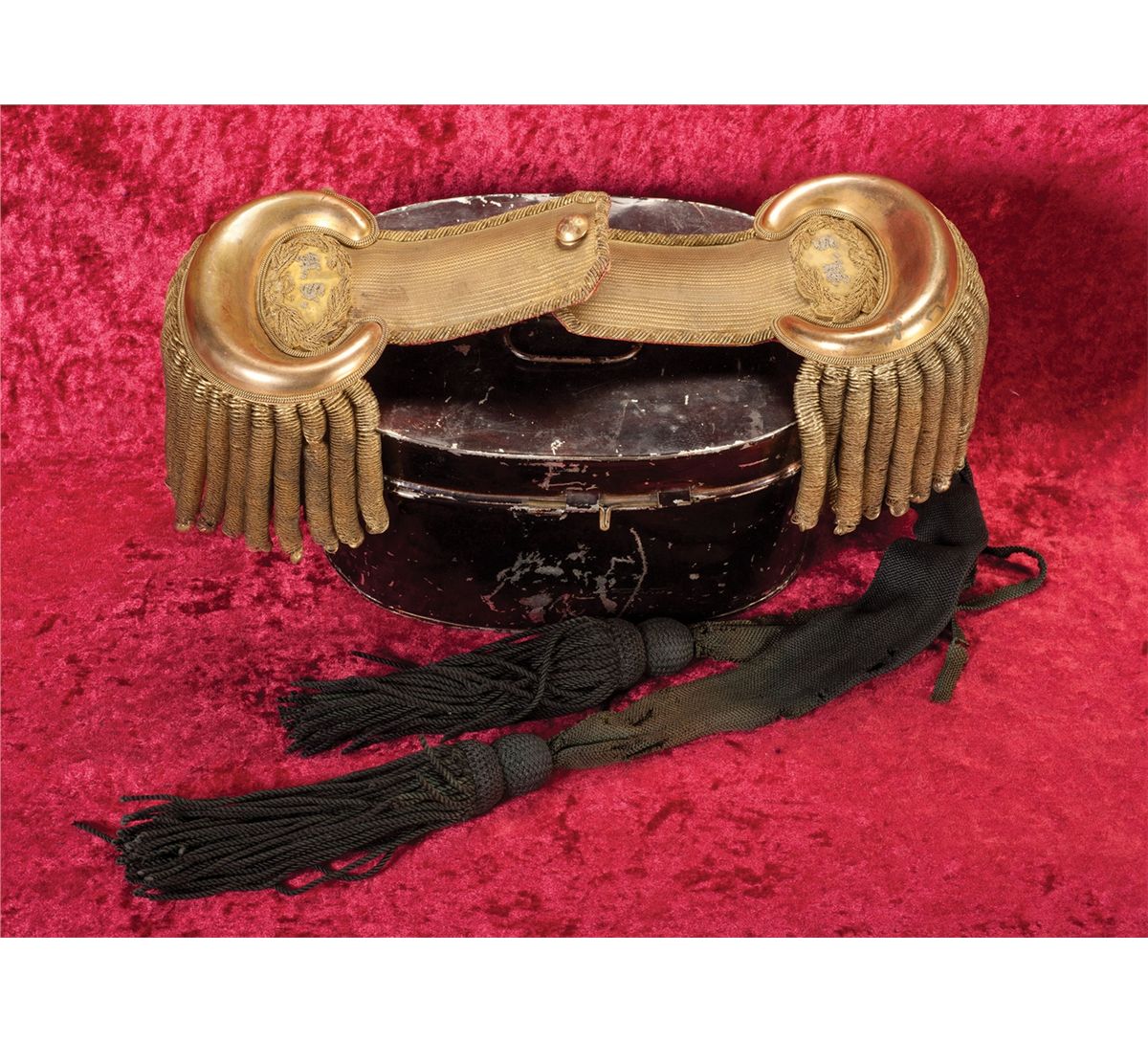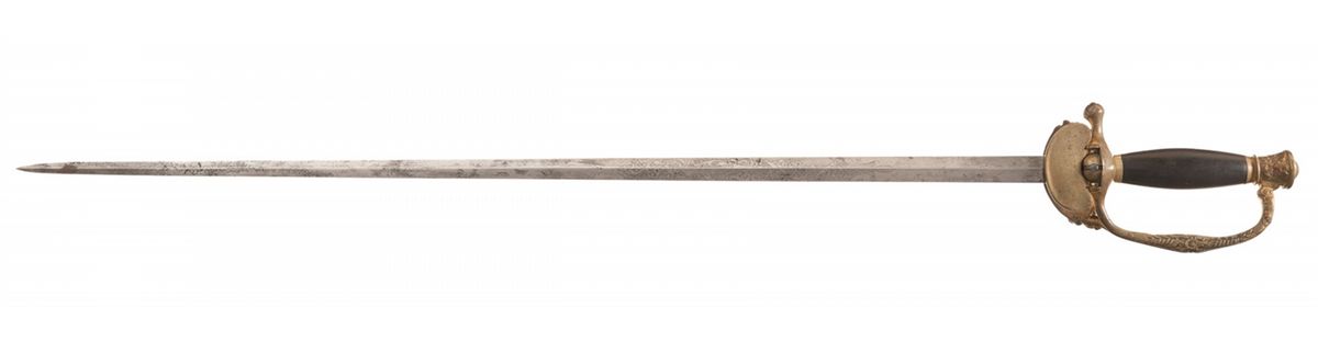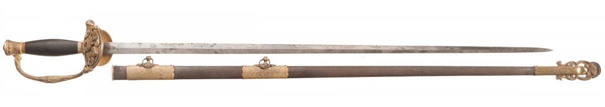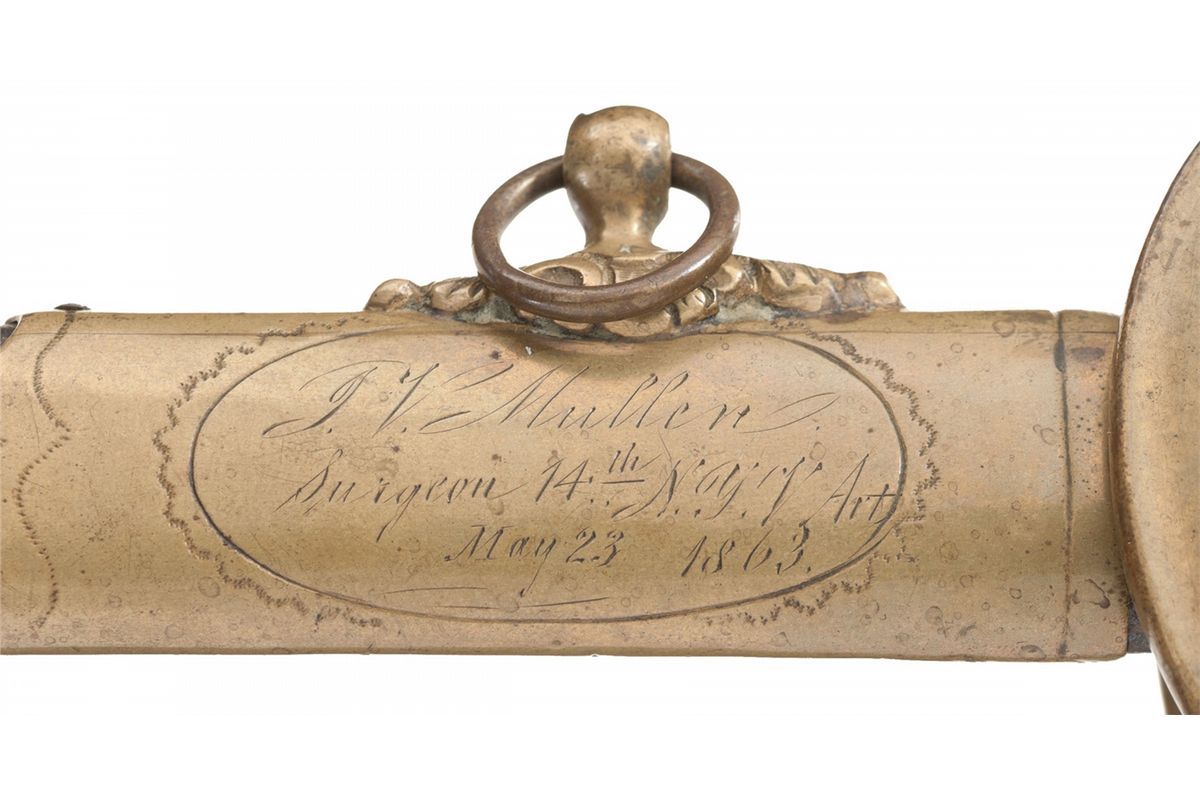 1) Non-regulation medical staff sword, measuring 36 1/2 inches overall, with a 30 inch double edged diamond cross-section blade, with an etched scroll pattern on the left side of the blade, "U.S." among scroll and checkerboard patterns on the right, and "4" stamped on the trailing edge of the ricasso. Gilt brass hilt, with a folding counter-guard, a raised design of an eagle clenching a ribbon in it's beak, a flag in one claw and a large book in the other on the guard, floral pattern rear quillion, floral and lightning designs on the knuckle guard, starry shield and eagle designs on the pommel, and a smooth grip. With a gilt brass fitted iron sheath, showing floral engraving on the outer face, pierced-through vinework on the drag, a white paint label near the tip attributed to the Wayne County Historical Society, and "I.V. Mullen/Surgeon 14th N.Y.V. Art./May 23 1863." on the top band. Information on Doctor Isaac V. Mullen is limited; records indicate that he was born circa 1827, received his degree from the Vermont Medical College, 7th oldest in the U.S., and established a practice in rural New York in the 1850s. On the outbreak of the war he joined up with the 13th New York Volunteer Infantry Regiment for 2 years of service, and re-enlisted with the 14th New York Volunteer Artillery on a 3 year contract which was cut short by the War's end. Later, he settled in Alexander, New York, establishing a medical practice and raising two sons into the medical profession. The 13th N.Y.V. Infantry was assembled in 1861 and almost immediately called to Federal service, participating in the Battle of Bull Run before establishing defensive positions at Camp Corcoran outside Washington, D.C., and suffered through a winter which included an outbreak of Black Measles before being assigned to the Army of the Potomac, where they participated in the Peninsula Campaign, the Siege of Yorktown, Second Bull Run, Antietam, and Fredericksburg before mustering out on May 14th, 1863. The 14th New York was assembled in 1863, recruiting heavily from veterans fresh out of 2 year service agreements, including the 13th Infantry, spending it's formative period performing garrison duty in and around New York Harbor before joining up with the Army of the Potomac. With the Army of the Potomac the 14th participated in the Battle of the Wilderness, Spotsylvania Court House, Cold Harbor and the Siege of Petersberg, with the record for Petersberg specifically calling out the "Mine Explosion", aka the Battle of the Crater, a botched attempt to breech Confederate lines with a massive underground bomb, and the siege, assault and occupation of Petersberg. The 14th later participated in the Grand Review in Washington, D.C. before mustering out on 26 August 1865. 2) Surgical sash, dark green with tassels, no makers marks visible. 3) Cased pair of medical officer's epaulettes, gold bullion construction on a padded red leather base, with Major-length wire tassels extending from a gilt brass plate, silver bullion "M.S." inside a gold bullion wreath and gilt American Eagle buttons. In a brown lacquered steel case. With a copy of a letter from Brendan Synnamon, of the Pennsylvania Antiques Appraisers Association and Appraisers Guild of America, who appraised the items in this lot.