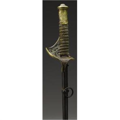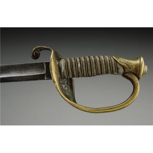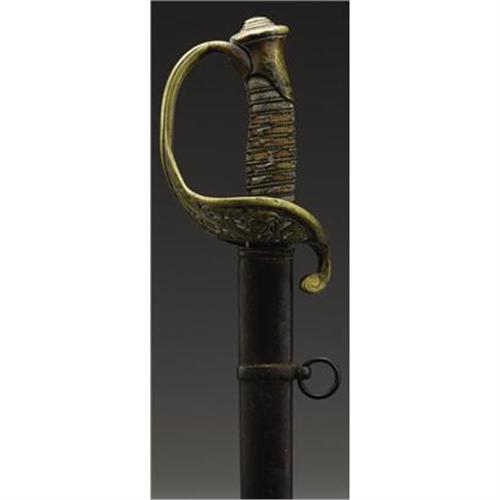 <B>Union Army Foot Officer's Sword.</B></I> This sword has a 31” highly engraved foliate patterned blade depicting a stand of flags above the crosshatched ricasso and a federal shield further up the blade that has seen much wear. At the midpoint of the fuller, there is engraved "U.S." The reverse of the blade is nicely engraved as well with "E. Pluribus Unum", a depiction of cannon and arms, as well as a federal eagle. The 4” grip is of ray skin, which has worn down to the underlying wood on one side. The highly carved guard retains some gilt however the knucklebow is slightly loose at the pommel cap. The metal scabbard has been highly used as well with a dark brown patina. This would make a great display piece.<BR><BR><b>Shipping:</b> Bats, Clubs, Sticks, Swords, Rif (<a target="_blank" href="http://www.heritageauctions.com/common/shipping.php">view shipping information</a>)