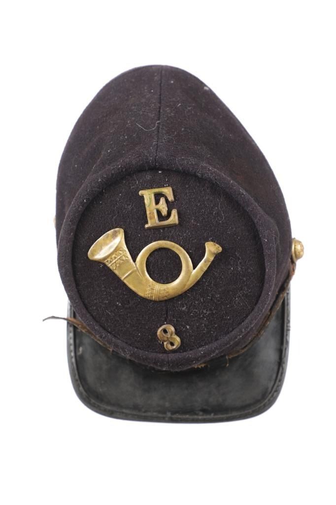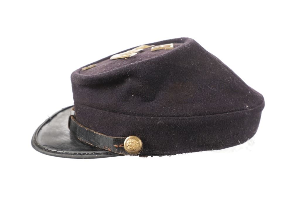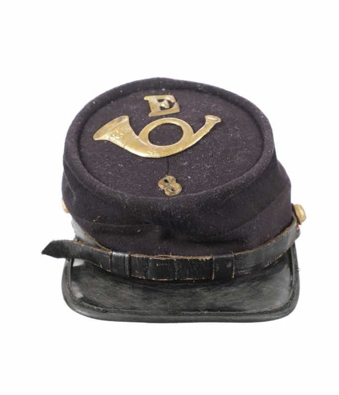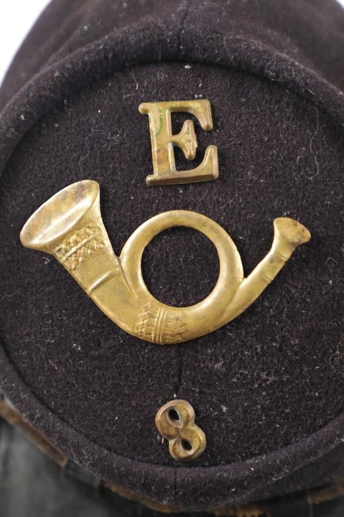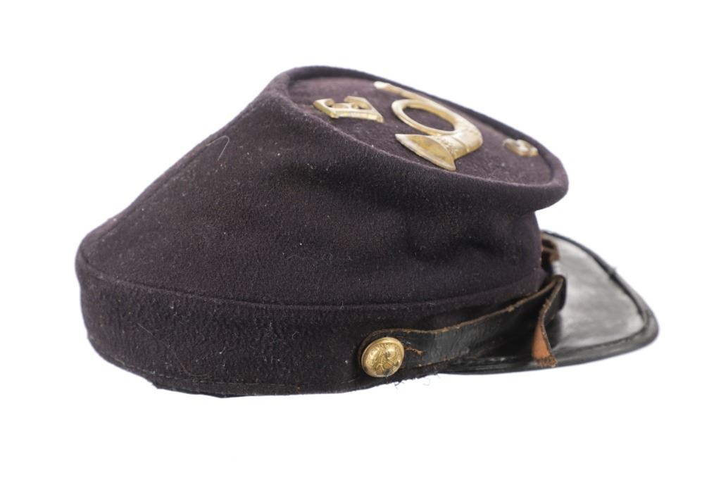 Featured in this lot is this re-enactment Union Army soldier Civil War kepi cover. The cover shows traditional Union soldier blue with a bugle and E - 8 on the top of the cover. The condition of this reenactment Kepi cover is well preserved with some wear to the leather band and patina to the brass insignia and buttons but otherwise shows well preserved condition. The measurements of this Kepi cover is 4 1/4" x 9 3/4" x 6 1/2". The collective weight of this cover is 4oz.