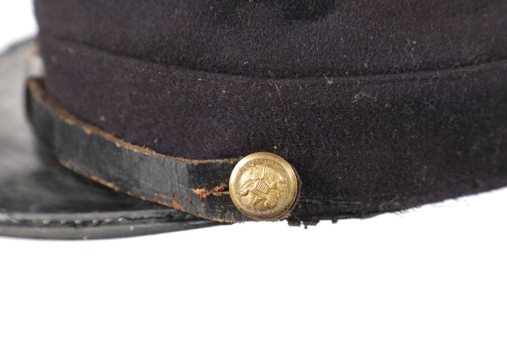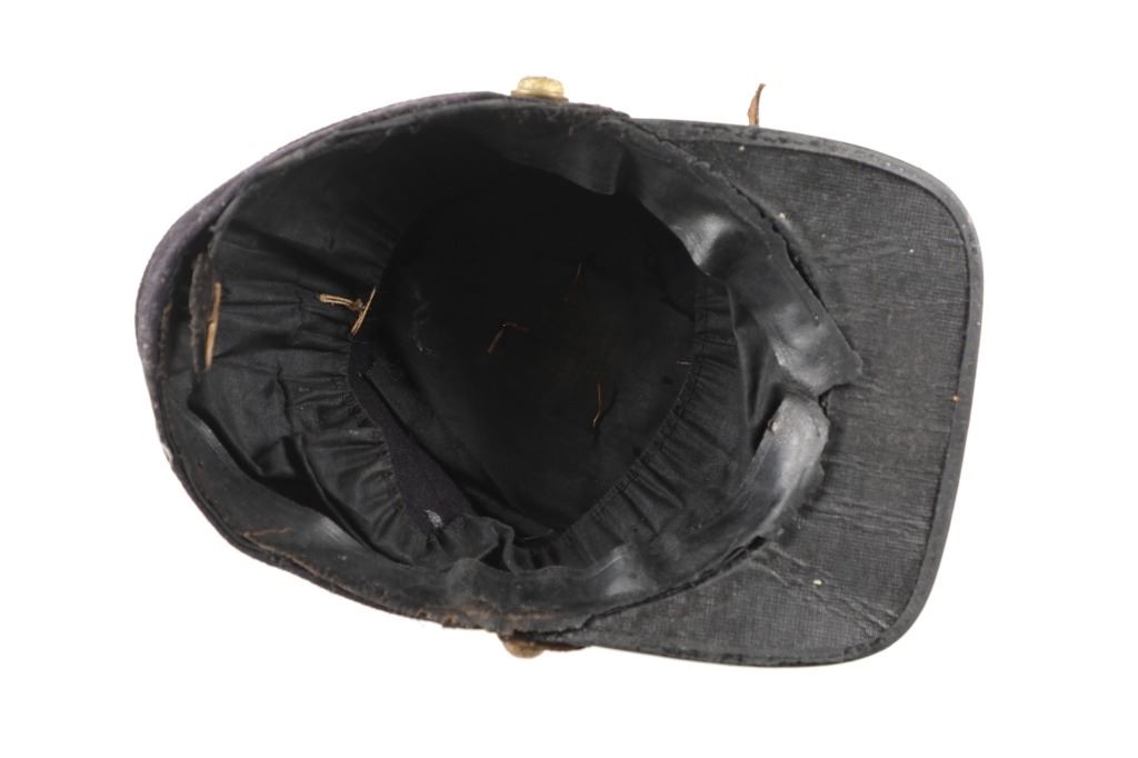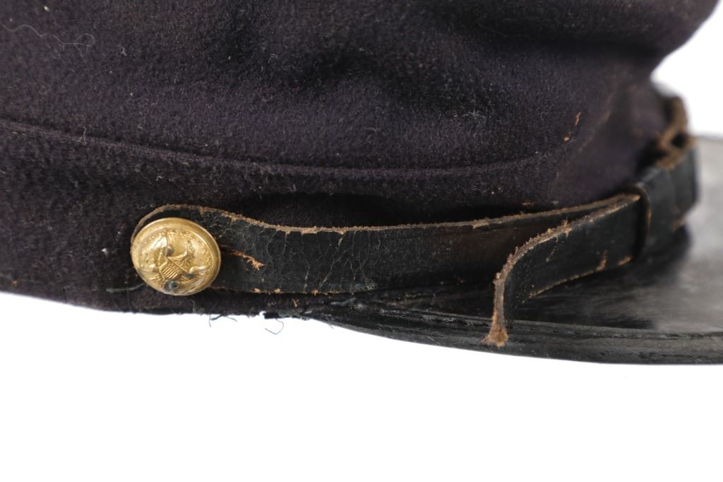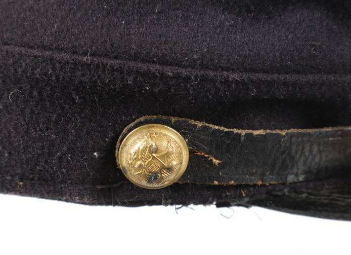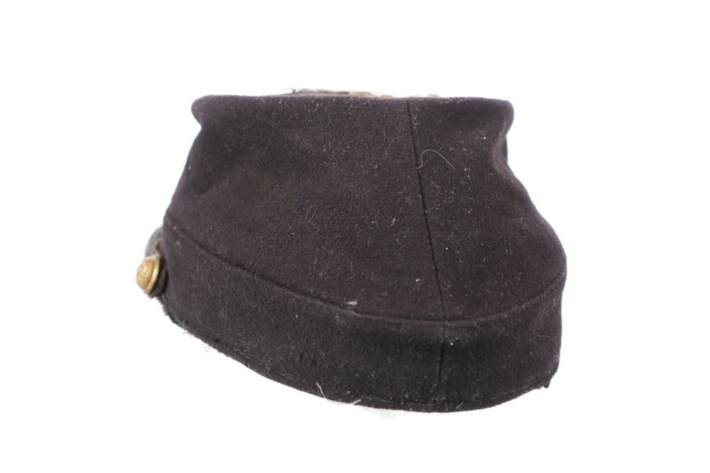 Featured in this lot is this re-enactment Union Army soldier Civil War kepi cover. The cover shows traditional Union soldier blue with a bugle and E - 8 on the top of the cover. The condition of this reenactment Kepi cover is well preserved with some wear to the leather band and patina to the brass insignia and buttons but otherwise shows well preserved condition. The measurements of this Kepi cover is 4 1/4" x 9 3/4" x 6 1/2". The collective weight of this cover is 4oz.