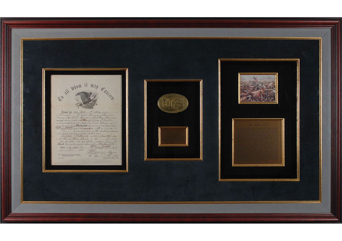 Two Union artifacts: war-dated DS, one page, 8 x 10, December 31, 1863. A discharge for “John P. Aldrich, a Private of Captain Herman Barries Company, (A), 2nd Regiment of Artillery Illinois Volunteers…is hereby discharged…by reason of entering the Veteran Service.”; and an oval-shaped replica Union “US” belt buckle. Both are nicely double-suede-matted and framed with two descriptive plaques and a small color image of a battle to an overall size of 38.5 x 24. In fine condition, with a few dents and dings to buckle.