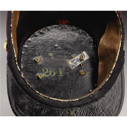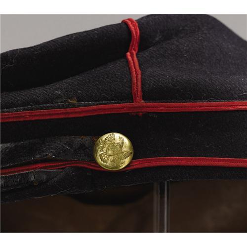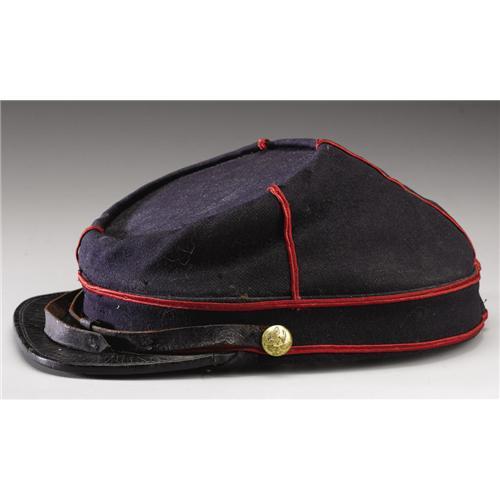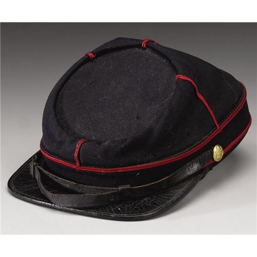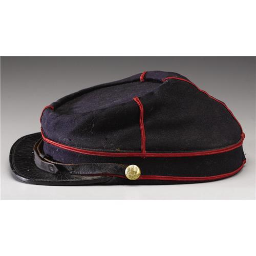 <B>Union Artillery Kepi.</B></I> This Union artillery kepi is in excellent condition with its eagle federal artillery "A" buttons anchoring the long chin strap at the sides. The red piping, designating the kepi as that of an artilleryman, circles the blue felt and rises to the top of the kepi on all four sides. The visor is intact and firmly attached to the cap. <BR><BR>The interior of the cap has no lining but does have a leather covered thick paper centerpiece that bears the maker's mark of Ridabock and Company of New York City. The 1½” leather sweatband is complete and has a slight separation at the back of the cap. This is an excellent artillery kepi with nice medium blue wool cloth and only one small hole at the top.<BR><BR><b>Shipping:</b> Miscellaneous Collectibles, Smal (<a target="_blank" href="http://www.heritageauctions.com/common/shipping.php">view shipping information</a>) <BR><BR><B>Important