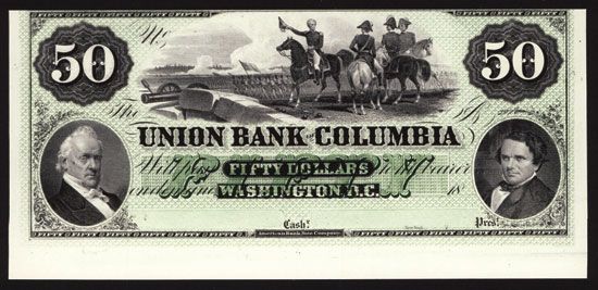 Washington, D.C. $50, 18xx (printed originally in the 1850-60's, this sheet is ca.1960-70's), $50, (DC-365-G8a), Modern ÒProprietary ProofÓ, portraits of Buchanon on lower left and Stephen Douglas on right with Jackson at Battle of New Orleans, 1813, in middle. Black printing with green underprint, printed on thin white card, Choice to Gem Uncirculated condition. ABNC. (ABN Commemoratives, AIA XI, May 15, 2012)