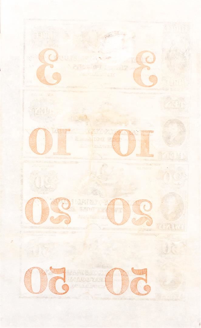 Uncut sheet of 4 notes from the Union Bank of New London, Connecticut featuring $3, $10, $20, and $50 denominations. The back of this sheet is blank. The sheet has minor staining and damage on the back, but otherwise in good condition.