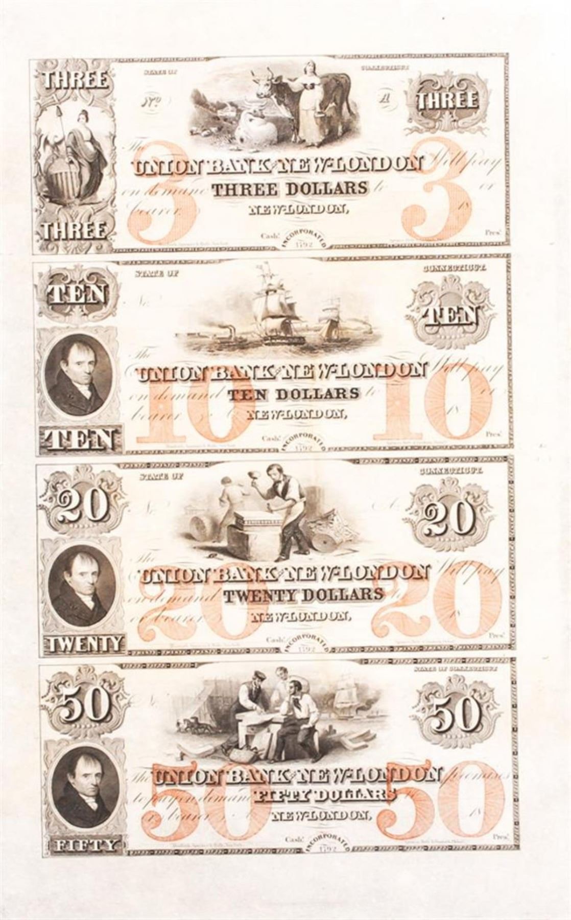 Uncut sheet of 4 notes from the Union Bank of New London, Connecticut featuring $3, $10, $20, and $50 denominations. The back of this sheet is blank. The sheet has minor staining and damage on the back, but otherwise in good condition.