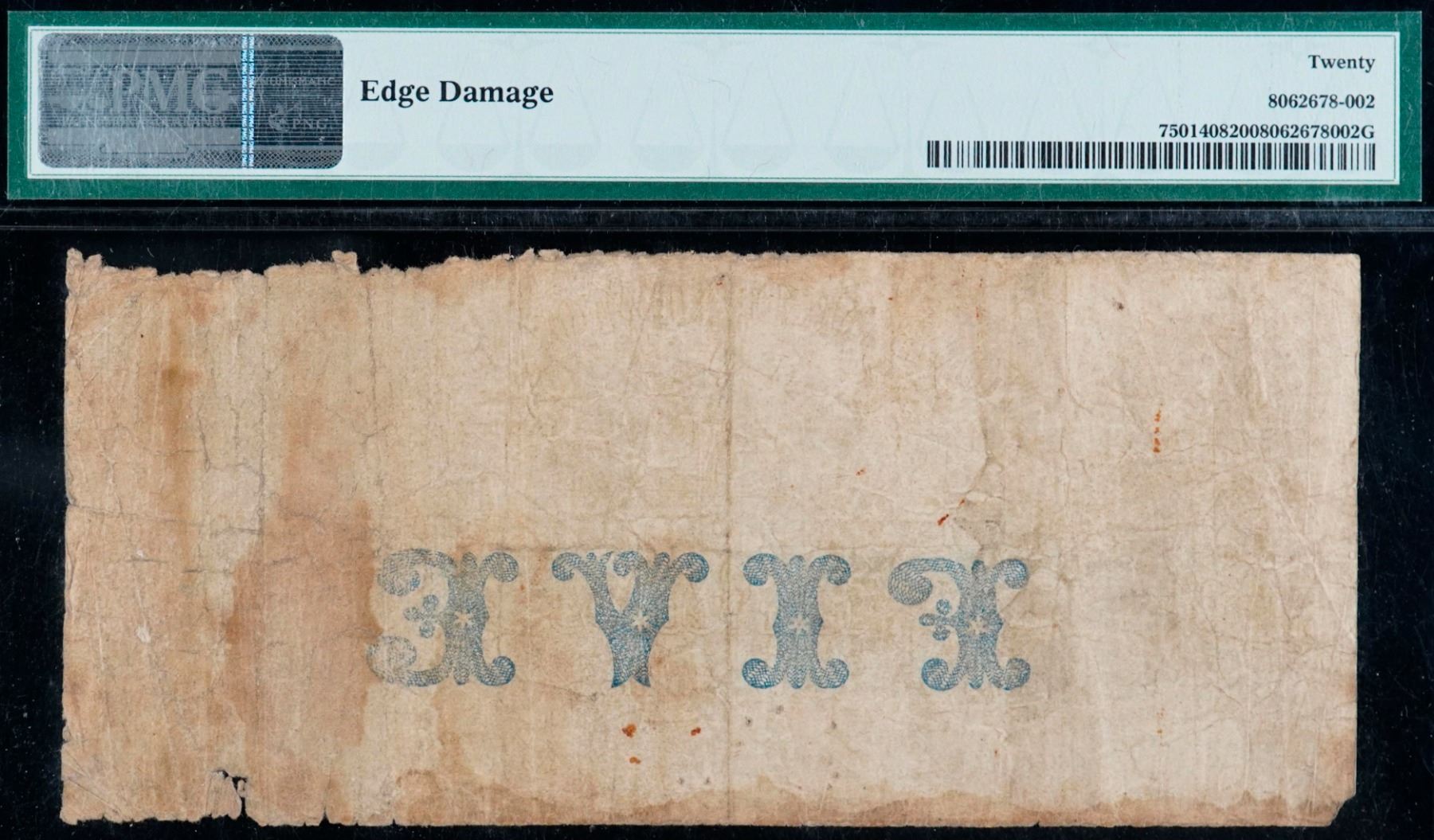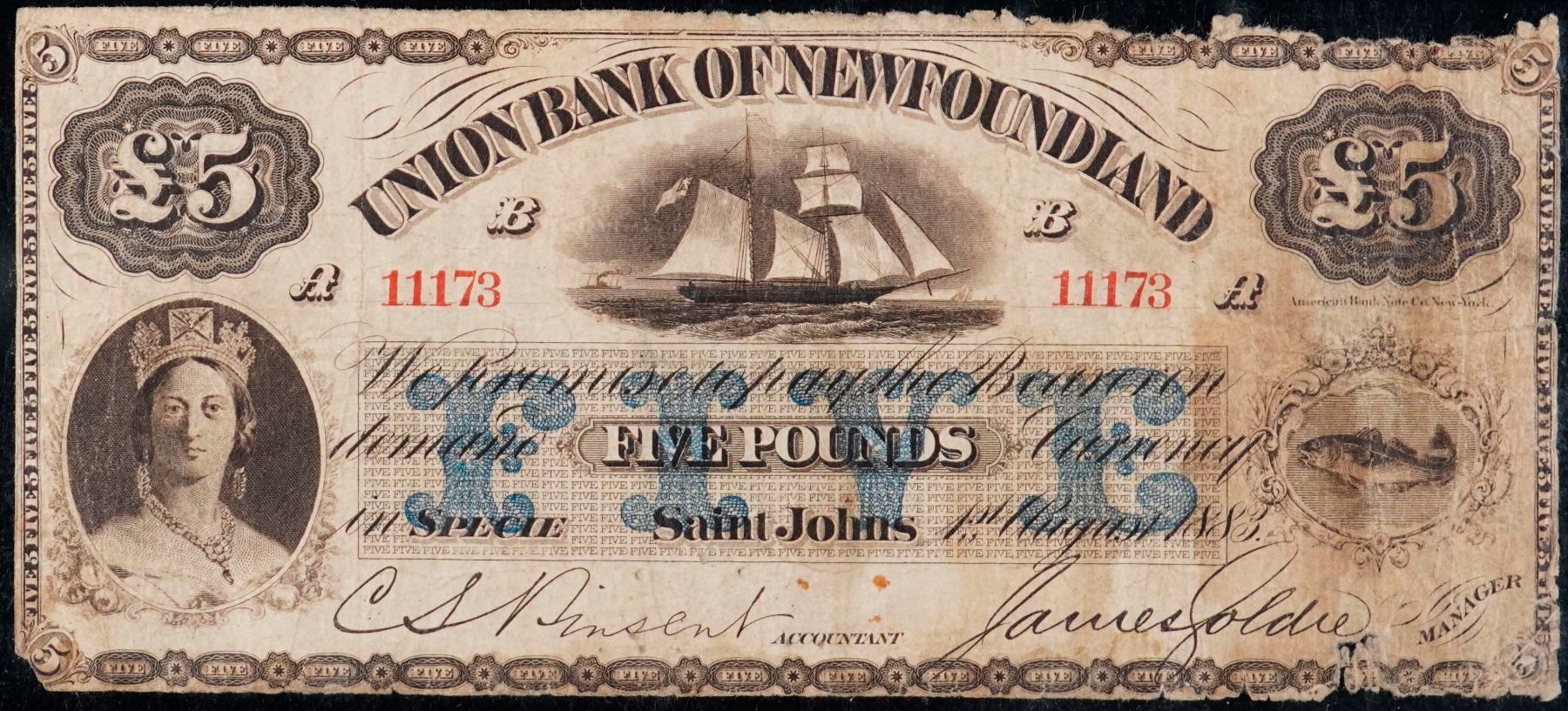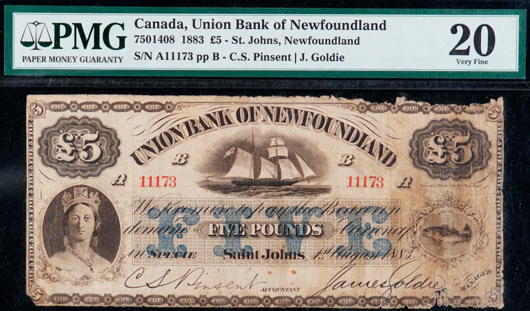 Union Bank of Newfoundland 1883 5£ CH-750-14-08 #B11173 PMG Very Fine-20, edge damage. Only 6 known examples. Very rare.