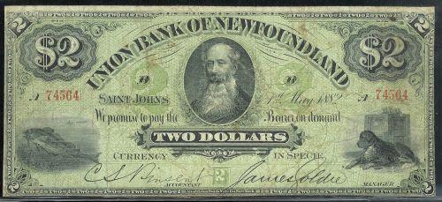 Union Bank of Newfoundland, $2 1882 CH-750-16-02 No. A74564 F+, another scarce and very popular banknote. Attractive vignette!
