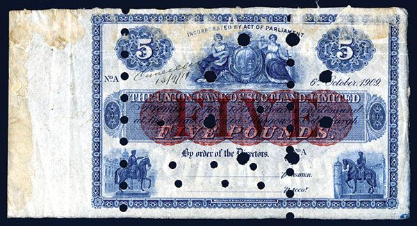 Scotland, 6th October, 1909, 5 Pounds, P-S806 Unlisted Specimen, Face Blue on orange-red underprint, face with archival notations, No serial numbers, CANCELLED and POC's, AU condition with light glue mounting remnants on top of face that may possibly be soaked, but rare note in any condition or format, W&S.