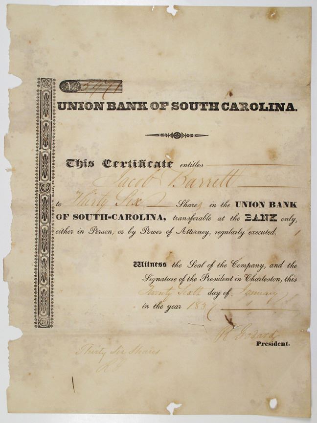 Charleston, South Carolina, 1837. 36 Shares I/U Stock Certificate, S/N 5471. Black text with dark brown handwriting, Black border at left, Embossed company seal at bottom left. Fine condition with staining, toning, and several holes. The Union Bank of South Carolina was one of two original banks in the state of South Carolina originally chartered.