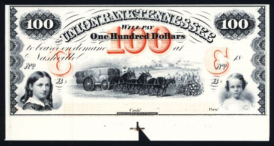 Nashville, Tennessee, 18xx (ca.1960-70's), $100, (TN-210-100Ba) Modern ÒProprietary ProofsÓ. The $100 note has mules pulling wagon filled with cotton. Black printing with no underprints printed on thin white card, large lower border, CU to Gem Uncirculated condition. ABNC. (ABN Commemoratives, AIA XI, May 15, 2012)