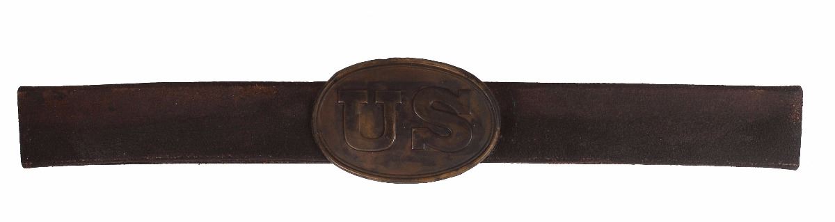 Field-procured, dark brown narrow leather waist belt measuring approximately 34? and 1.5? wide with a brass, die-struck, lead-filled oval belt plate which measures 3.5 x 2.25 and has an overall dark ochre patina with lighter spots along the edges. The plate has a noticeable inward bend at the left edge and moderate oxidation present on the lead filling on the reverse. Leather belt has a heavily flaked and crazed exterior with numerous scuffs and blemishes, but is still intact and relatively supple for its age. The tag end of the belt has a pointed tip and regularly spaced adjustment holes, but the buckle end has an uneven border with hand cut pass-throughs for the arrowhead fasteners of the plate. This would indicate that the belt itself was probably salvaged from some other sling or harness strap encountered in the field. The plate has a slightly more open design with more space above and below the “US” than is usual for Civil War era plates, very similar to the 1839 Pattern Dragoon plate (no. 24 in Plates and Buckles of the American Military 1795–1874 by Sydney C. Kerksis; 4th ed. 1991), but without the looped wire fasteners. This is a fine example of a Civil War soldier's belt, resourcefully ‘repurposed’ from something else.