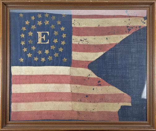 Union Cavalry Guideon, swallow tail shape, measuring approx. 29” by 36”. Framed for display. The flag has been conserved and souvenired and shows restitching, but is original to the Civil War period. The flagshows mothing and normal aging and shows 36 stars around “E”. Est: $1,000 - $3,000