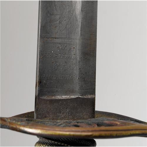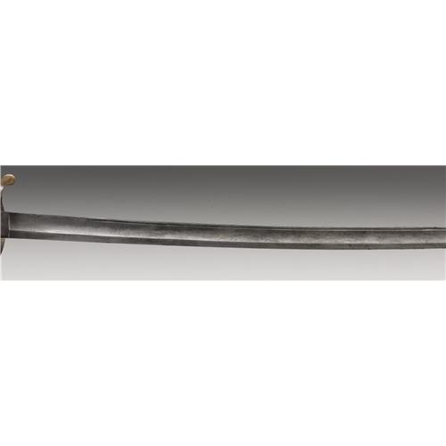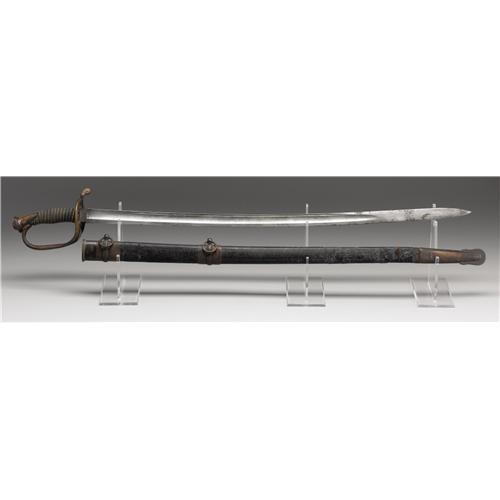 <B>Union Civil War Foot Officer's Sword With Beautifully Etched Blade, 2nd Lieutenant Francis E. Holt.</B></I> This sword has a patriotic motif etched on the ricasso by the maker, W. H. Horstmann and Sons, Philadelphia. The sword is identified to Captain Francis E. Holt of the 1st New Jersey Infantry, Company E. Holt entered service on May 23, 1861 as a sergeant and was later promoted to 2nd lieutenant on June 3, 1861. He had a distinguished record having served in 15 major engagements. He was wounded in action at Gaines Mill, Virginia being shot in the lower arm on June 27, 1862. He was discharged September 12, 1864 near Winchester, Virginia. After the war he received a disability pension as a result of his wounds. He had married after the war and had five children. He died on June 7, 1878. <BR><BR>This sword has a dark untouched patina, original red shagreen covered grips and includes its original brass mounted leather scabbard with leather washer. The mounts of the scabbard have the same dark rich patina. The scabbard is engraved "F.E.H." with some repair on the lower end, but is complete. <BR><BR>Included with the sword is an interesting archive of Holt's military and pension records. A <I>carte de visite</B></I> of Holt backmarked "Victor Piard, 150 Grand Street, Jersey City" accompanies the sword. Written in ink verso at the top is "<I>Lt. F. E. Holt 1 N.J.</B></I>" and in pencil at the bottom "<I>Grandfather Holt Civil War picture</B></I>". Dated circa 1862, the CDV is a standing view of Holt as a 2nd lieutenant holding the sword and wearing a kepi and a VI Corps badge on his frock coat. A great sword identified to a soldier who saw much action. <BR><BR><I>Provenance</B></I>: Thomas R. Holt - Holt's great-grandson<BR><BR><b>Shipping:</b> Large Collectibles (<a target="_blank" href="http://www.heritageauctions.com/common/shipping.php">view shipping information</a>)
