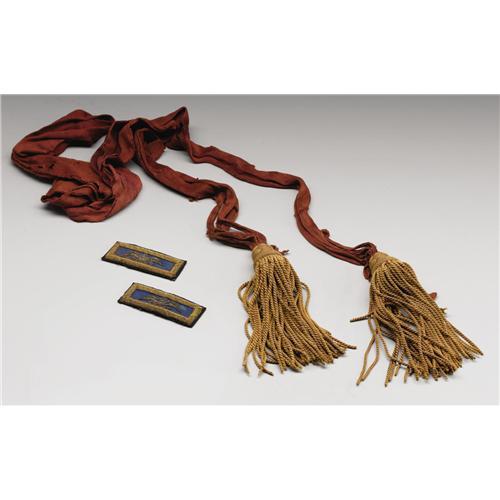<B>Union Colonel's Shoulder Straps with "Silver Eagle" and Officers Crimson Red Belt Sash</B></I> with tasseled knots. This is a great combination and exhibit group for a Union colonel. The crimson red sash and the colonel's shoulder boards, which are hand sewn with "<I>Silver Eagles</B></I>" on a blue infantry felt background, are in excellent condition. This is a superb display of infantry officer insignia.<BR><BR><b>Shipping:</b> Large Collectibles (<a target="_blank" href="http://www.heritageauctions.com/common/shipping.php">view shipping information</a>)