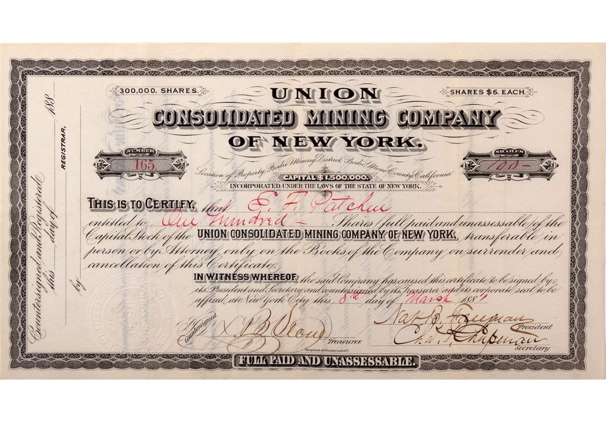 Bodie Mining District. Incorporated in New York in 1880. Cert. #165, issued to E.F. Patchur in 1881 for 100 shares. Signed by Nat B. Freeman as president and by Chas. Chapman as secretary. Black on cream with embossed seal. U/C. Printer: Henry Koch, New York. Unusually large at 6.5" x 11.25” and in XF condition. Extremely rare. -58774