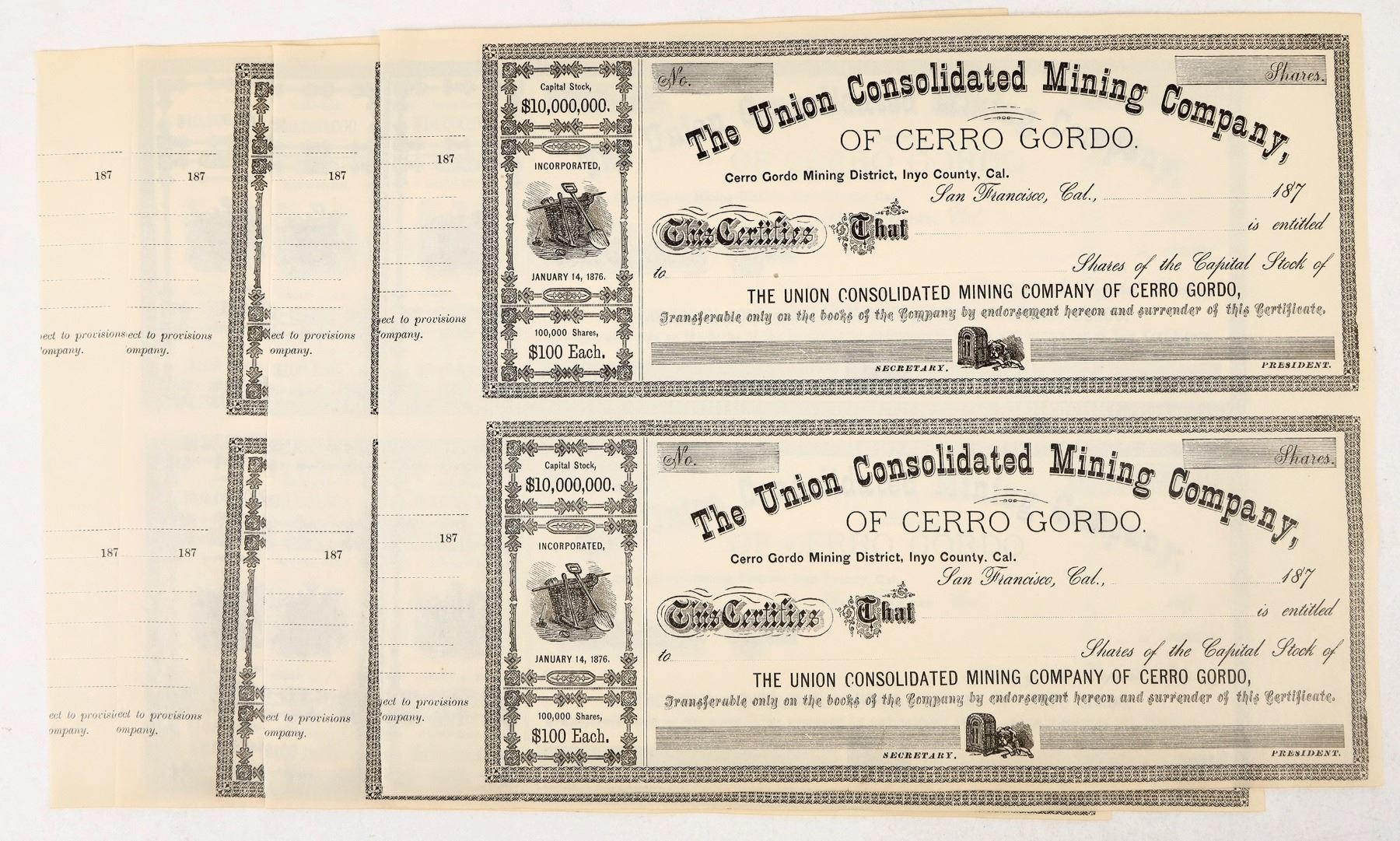Group of 4 sheets of two unissued stocks each. c.1870s. Cerro Gordo Mining District, Inyo County, Cal. Very famous mine. We've never sold an issued example!