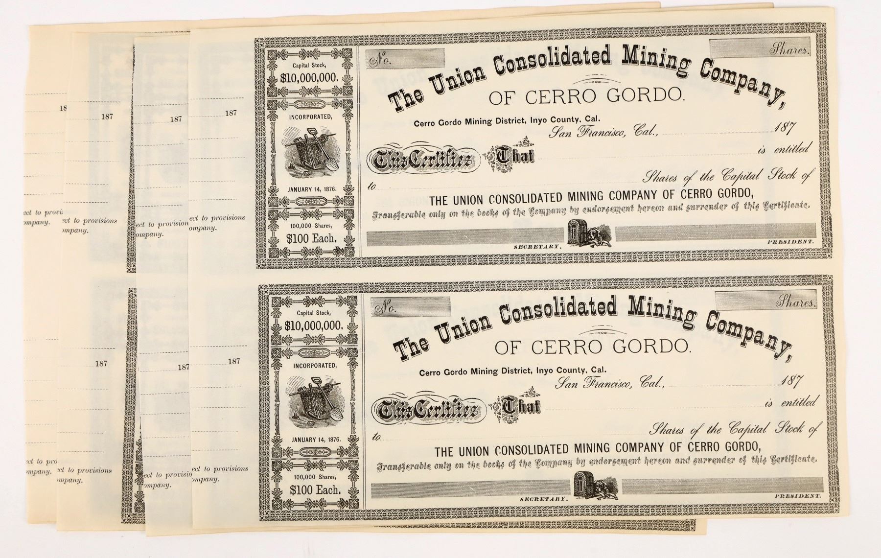 Group of 5 sheets of two unissued stocks each. c.1870s. Cerro Gordo Mining District, Inyo County, Cal. Very famous mine. We've never sold an issued example!