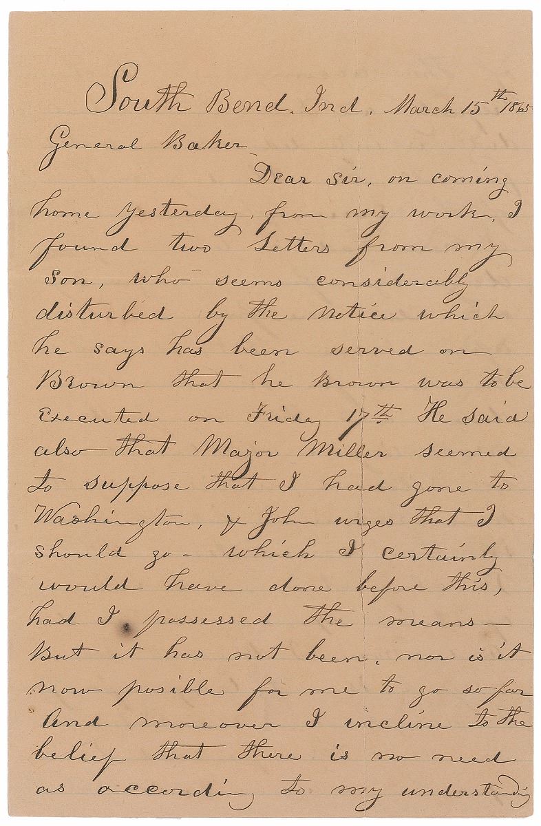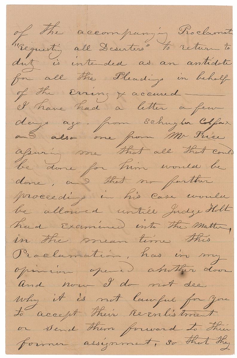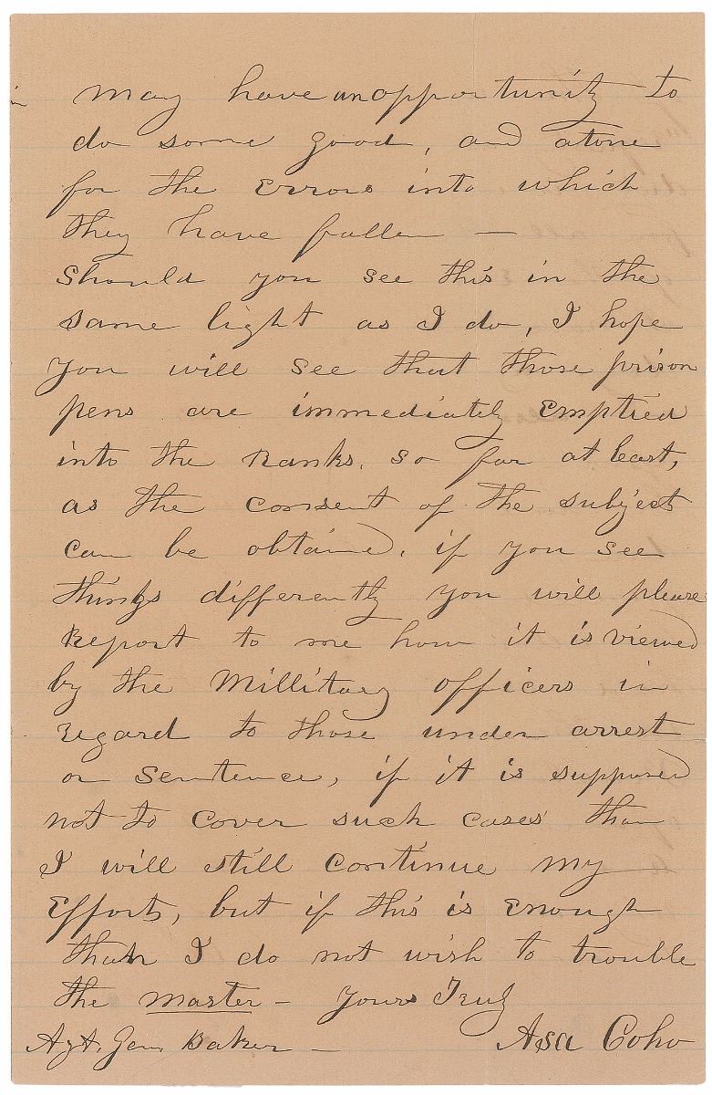 ALS signed “Asa Coho,” three pages on two adjoining sheets, 5 x 7.75, March 15, 1865. Letter to General Baker. In part: “My son…seems considerably disturbed by the notice which he says has been served on Brown that he Brown was to be executed on Friday 17th…I incline to the belief that there is no need as according to my understanding of the accompanying Proclamation ‘Requesting all Deserters’ to return to duty is intended as an antidote for all the Pleadings in behalf of erring & accused…I do not see why it is not lawful for you to accept thieir reenlistment or rend them forward to their former assignment, so that they may have an opportunity to do some good, and atone for the errors into which they have fallen…I hope you will see that those prison pens are immediately emptied into the ranks.” In very good condition, with intersecting folds with a repaired vertical separation passing through the right side, partial separations to adjoining fold, and uniform toning. Accompanied by the newspaper clipping of the proclamation that Coho enclosed.