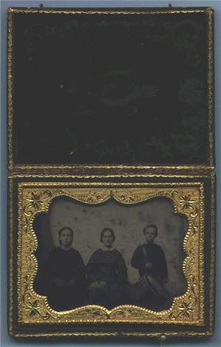 Union Drummer Boy. Ambrotype, c. 1861, of young boy standing beside seated sister and mother. The boy, who appears to be in his early teens, wearing a dark military style jacket, hatless, with strap of a drum slung over right shoulder, held in place with hand. Regulation drum, its size almost too large for the light-haired boy to handle. He seems to be holding drumsticks in his other hand. Horizontal format, 3 -1/4 x 4 -1/4 , gold metal frame with green velvet facing, brown case with medallion pattern. Some speckles in blank backdrop, else image very fine. Reminiscent of a "farewell" picture, should the boy not return.