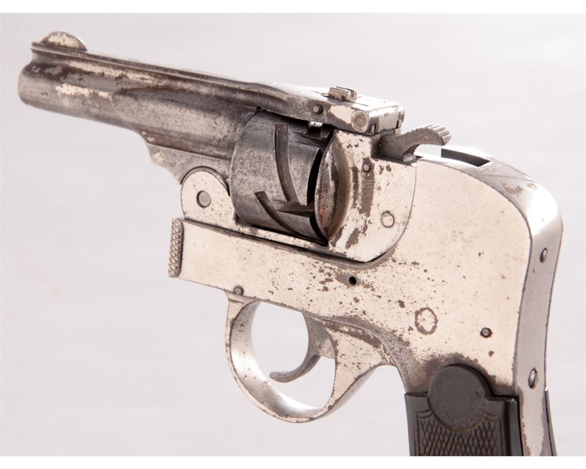Union Firearms Automatic Revolver, #47, .32 S&W cal., 3'' barrel, nickel finish, checkered horn grips closely patterned after the British Fosbery, using recoil to revolve the cylinder and cock the hammer. Marked on right side of frame ''Union Firearms Co./Toledo.O. Lefever Pat.''. Condition is very good retaining approx. 60% nickel with most of the losses to the cylinder and forcing cone area of barrel. Grips show flattening to checks. Action functions as designed, bore is good. Scarce in any condition. Est.: $600-$800. (C&R)