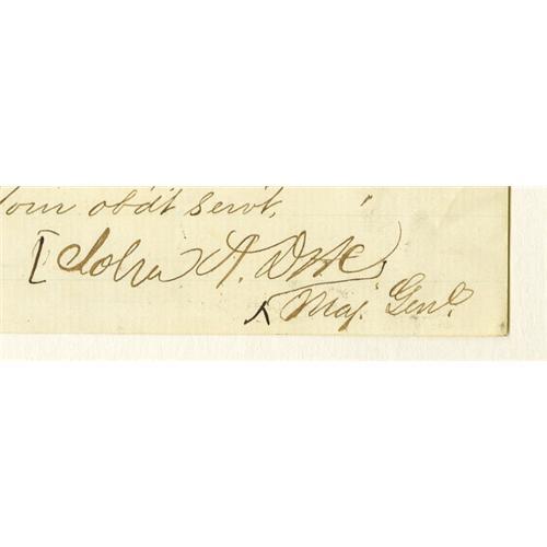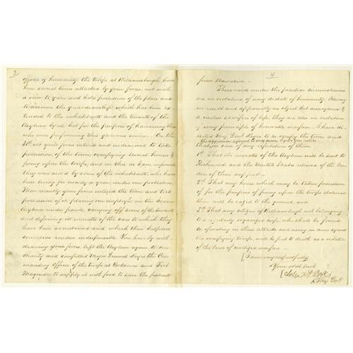 <B>Union General John Adams Dix 1863 Letter Signed to Confederate General Henry A. Wise</B></I> "<I>John A. Dix</B></I>", three pages, 8" x 10", "Head Quarters Department of Virginia" letterhead, Fort Monroe, Virginia, April 28, 1863. In this important letter, Dix strongly advises Wise to cease his attacks on the Union forces occupying Williamsburgh. It reads, in full: "<I>The Town of Williamsburgh has been occupied, as you are aware, by the troops under my command as a picket Station or outpost of Yorktown. A large portion of the inhabitants are known not to be well disposed to the Government of the United States. They have nevertheless, while quietly pursuing their domestic avocations, been unmolested, and have been permitted to supply themselves with the necessaries and comforts of life at Yorktown and Fort Monroe. The Insane Asylum at Williamsburgh has been put under the Superintendence of an Army Surgeon and its three hundred helpless inmates supplied, at the expense of the United States, with every thing necessary to their comfort and with the remedial treatment they require. While exercising these offices of humanity, the troops at Williamsburgh have been several times attacked by your forces, not with a view to gain and hold possession of the place and to assume the guardianship which has been extended to the inhabitants and the tenants of the Asylum by us, but for the purpose of harrassing those who were performing this generous service. - On the 31st ult. your forces entered and endeavored to take possession of the town, occupying several houses & firing upon the troops; and in this, as I am informed, they were aided by some of the inhabitants, who have been living for nearly a year, under our protection. More recently your forces entered the town and took possession of it, placing our employes in the Insane Asylum under parole, carrying off some of the servants and depriving its inmates of the care to which they have been accustomed and which their helpless condition renders indispensable. You have by withdrawing your forces, left the Asylum again to our charity and compelled Major General Keyes the Commanding Officer of the troops at Yorktown and Fort Magrader to supply it with food to save the patients from starvation. - <BR><BR>These raids under the peculiar circumstances are in violation of every dictate of humanity. Having no result and apparently no object but annoyance & a useless sacrifice of life, they are also in violation of every principle of honorable warfare. - I have directed Maj. Genl. Keyes to re-occupy the town; and that the aggressions referred to may cease, I give you notice in case of any repetition of them. 1st- That the inmates of the Asylum will be sent to Richmond, and the United States relieved of the burden of their support; - 2nd That any house which may be taken possession of for the purpose of firing upon the troops stationed there will be razed to the ground; and 3rd That any citizen of Williamsburgh not belonging to a regularly organized corps, who shall be found co-operating in these attacks and rising in arms against the occupying troops, will be put to death as a violator of the laws of civilized warfare.</B></I>" Major General Dix, at this time, was commander of the Department of Virginia. Wise, a former governor of Virginia who signed the death warrant for John Brown, was a brigadier general who would later fight bravely with Robert E. Lee at Appomattox Court House and urge him to surrender. Fine condition.<BR><BR><b>Shipping:</b> Small Flat (<a target="_blank" href="http://www.heritageauctions.com/common/shipping.php">view shipping information</a>)