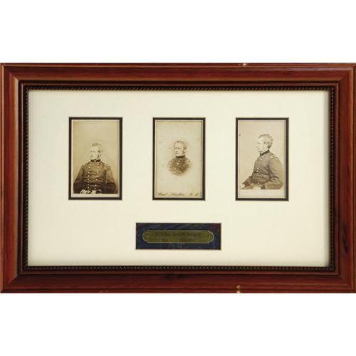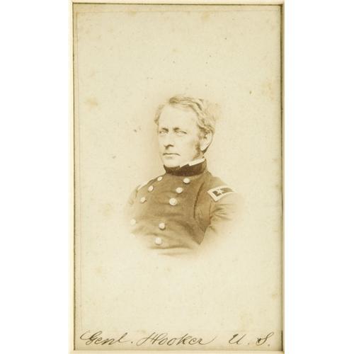 <B>Union General Joseph Hooker Group of Three Framed Brady <I>Cartes de Visite</B></I></B></I> <B>Framed Together.</B></I> Each of the three images is matted, with the visible portion of each CDV measuring 2.25” x 3.5”. The entire piece is framed to an overall size of 17.25” x 11”. A brass nameplate underneath the images reads “GENERAL JOSEPH HOOKER / USA 1814-1879”. All three images are the work of prolific Civil War photographer Matthew Brady. One CDV is marked “Brady's National Photographic Portrait Galleries” on the reverse, and the other two are from E & H. T. Anthony from the Brady negatives. The middle image is signed in an unknown hand at the bottom “<I>Genl. Hooker U.S.</B></I>”. All images are in fine condition, with some wear present to the image fields, but not detracting from the overall appeal. The middle image displays some minimal foxing, not affecting the actual image in the center. This is a handsome display piece for any Civil War CDV collector.<BR><BR><b>Shipping:</b> Framed - with Glass, Medium (<a target="_blank" href="http://www.heritageauctions.com/common/shipping.php">view shipping information</a>)