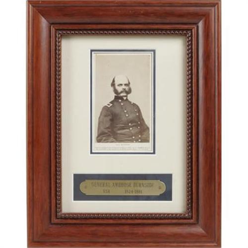 <B>Union General Ambrose Burnside Framed <I>Carte de Visite</B></I></B></I><B> Taken by D. Appleton.</B></I> The image is matted, with the visible portion of the CDV measuring 2.25 x 4. The entire piece is framed to an overall size of 7.75" X 9.75". A brass nameplate underneath the image reads GENERAL AMBROSE BURNSIDE / USA 1824-1881. Burnside was a railroad executive, inventor, industrialist, and politician from Rhode Island, serving as governor and a U.S. Senator. As a Union Army general in the American Civil War, he conducted successful campaigns in North Carolina and East Tennessee, but was defeated in the disastrous Battle of Fredericksburg and Battle of the Crater.<BR><BR><b>Shipping:</b> Framed - with Glass, Small (<a target="_blank" href="http://www.heritageauctions.com/common/shipping.php">view shipping information</a>)