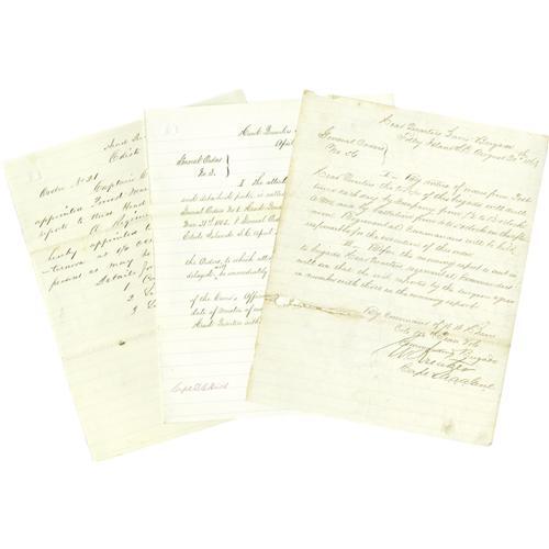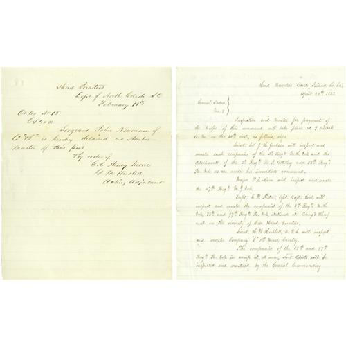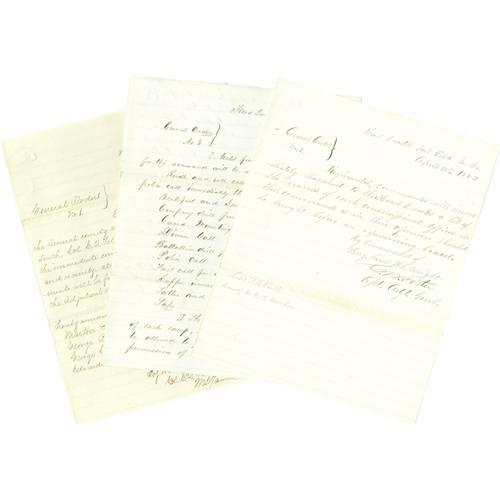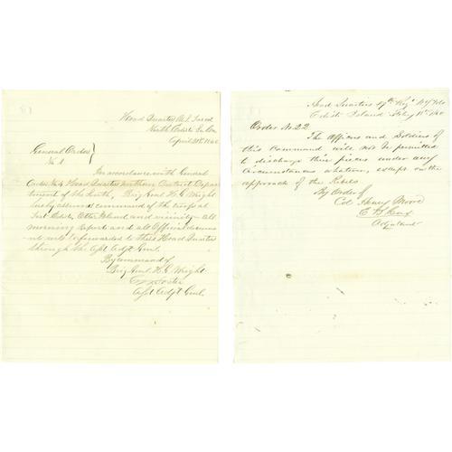 <B>Handwritten Union General Orders From South Carolina Barrier Islands.</B></I> This series of nine letters from the barrier islands including Edisto Island of South Carolina during the Civil War give insight into the everyday administrative happenings of the Union troops in mid-1862. Three of the letters are written and signed by C. W. Foster, then a major in the Union army and an assistant adjutant general. Foster was later in charge of the Bureau of Volunteer Troops that concerned the enlistment of black Union soldiers during the war. The letters are all 7.75" x 9.5" and in very fine condition.<BR><BR><b>Shipping:</b> Small Flat (<a target="_blank" href="http://www.heritageauctions.com/common/shipping.php">view shipping information</a>)