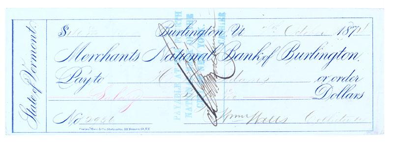 WILLIAM WELLS (1837-1892) Union brevetted brigadier and major general and later a full-rank brigadier general of volunteers during the Civil War. Wells served at, among others. the battles of Gettysburg, Winchester, Cedar Creek, Petersburg, and the Appomattox campaign. DS 8 1/2” x 2 3/4” Burlington, Vermont. October 7, 1874. Partially Printed Bank Check payable to H.H. Adams in the amount of $40.80. Signed as Maker by Wells as Collector for Vermont. Pen cancellation slightly affects the first letter of Wells’ signature. Very Fine.