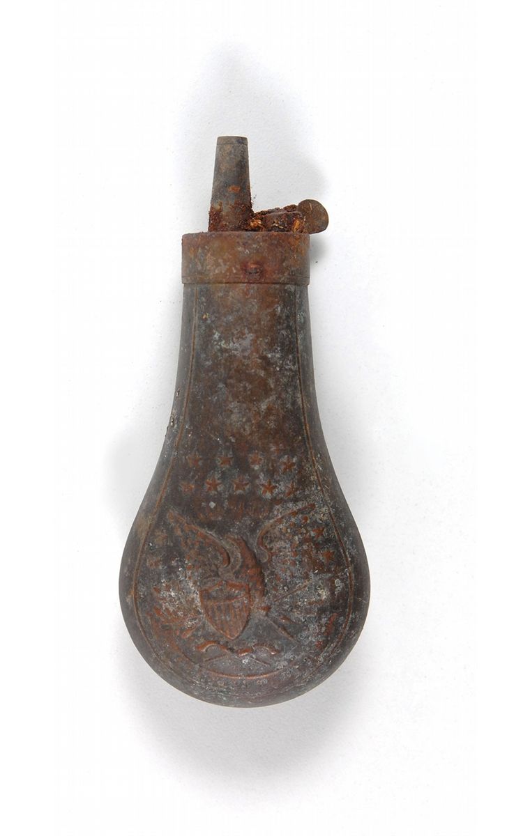 Colt pattern eagle powder flask, 5? in length, with a raised American eagle with shield on both sides. The spring is frozen and rusted and the brass exhibits a heavy patina. In good condition.