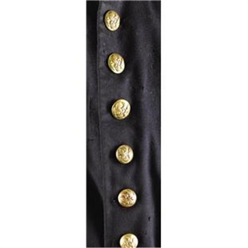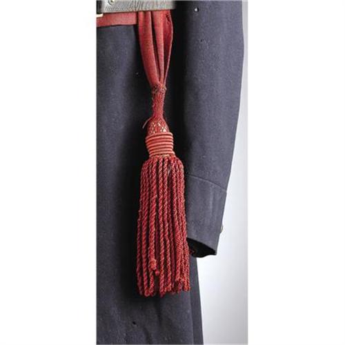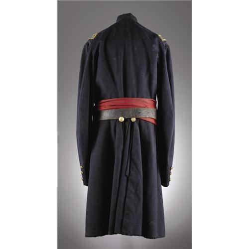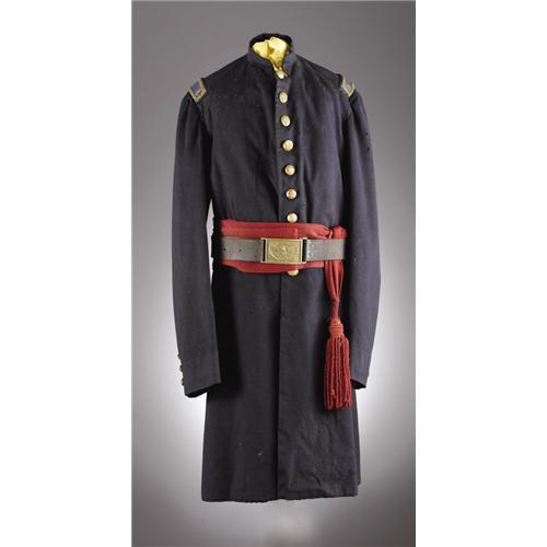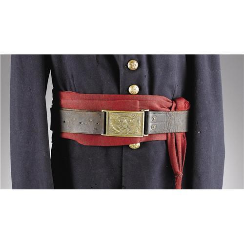 <B>Union Infantry Officer's Nine-Button Frock Coat</B></I> with 1st lieutenant shoulder straps, crimson sash, belt, and buckle. The condition of the coat is fair, with numerous moth holes and an old 6" stitched repair on the front breast. Complete with lining, the coat displays well as an actual used piece of history. Sash is in poor condition, it shows much use and has many holes. The belt and eagle buckle are solid and attractive (no hangers). When placed on a mannequin, this three-piece set presents itself very well.<BR><BR><b>Shipping:</b> Large Collectibles (<a target="_blank" href="http://www.heritageauctions.com/common/shipping.php">view shipping information</a>)