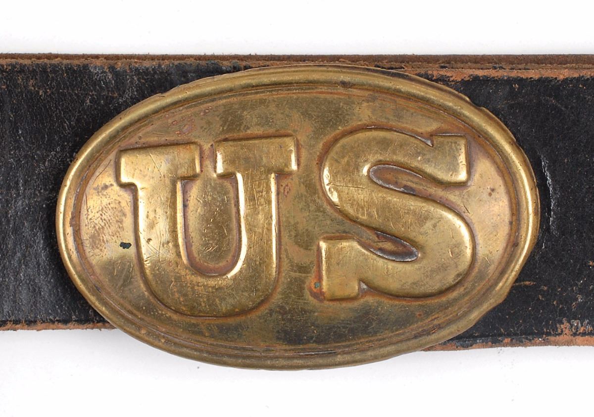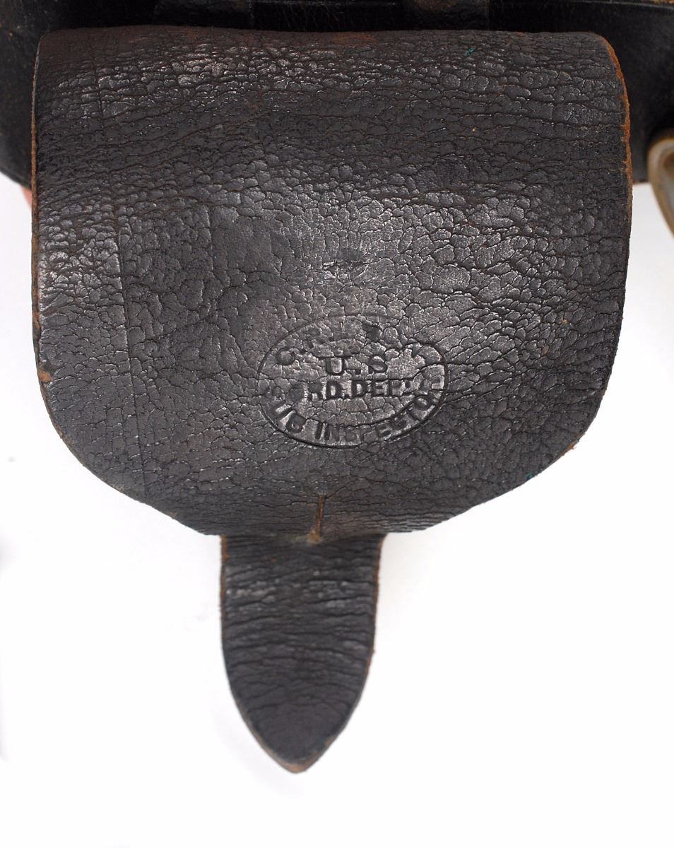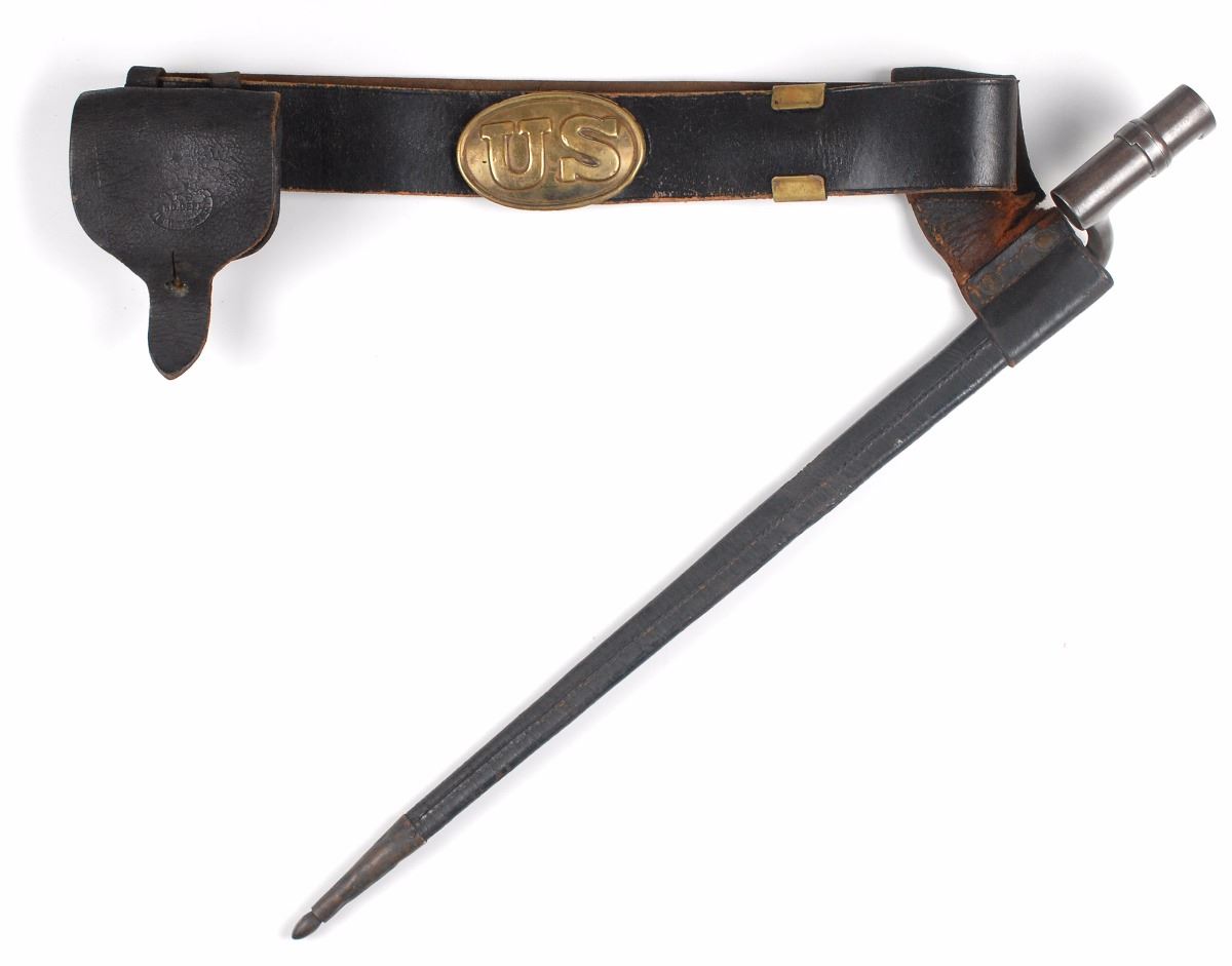 Handsome leather non-issue infantry waist belt set, consisting of the dark leather 2? wide belt, an M1839 ‘puppy paw’ style US brass belt plate, cap box with impressed inspection stamp on the flap and original wool lining, brass-tipped leather scabbard, and US-stamped .58 caliber angular bayonet. In very good condition, with some cracking and flaking to leather, and a tear through half of the scabbard loop (the remainder still firmly attached).