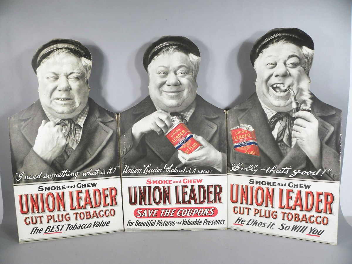 Union Leader Cut Plug Tobacco Cardboard Tri-Fold Window Display. Depicting, "Bunny" the comedian. Copyright 1914, the Forbes Litho Co. One small scratch in center panel and some slight edgeware otherwise excellent condition. 44 X 28 inches.
