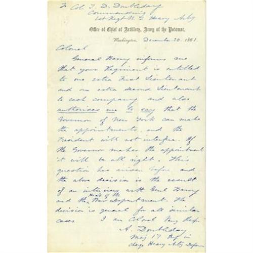<B>Union Major General Abner Doubleday Autograph Letter Signed,</B></I> “<I>A. Doubleday</B></I>”, one page on Army of Potomac Chief of Artillery letterhead, 5” x 8.25”, Washington, D.C., December 20, 1861, to his brother, Colonel T. D. Doubleday. A strictly business letter penned by Doubleday early in the war when he was a Major of artillery. Only the surnames betray a family link between the letter's author and its recipient. Doubleday writes in part, “<I>…the Governor of New York can make appointments, and the President will not interfere. If the Governor makes the appointment it will be all right…</B></I>”. Very fine condition.<BR><BR><b>Shipping:</b> Flat Material, Small (<a target="_blank" href="http://www.heritageauctions.com/common/shipping.php">view shipping information</a>)
