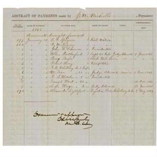<B>Union Major General Edward R. S. Canby Document Signed,</B></I>” <I>Examined & approved Edw Canby,</B></I> two pages, partially printed Army accounting sheet, 1868, possibly North Carolina. Trivial splits along top margin. Fine condition.<BR>E. R. S. Canby received the surrenders of the last two major Confederate armies in the field. However, he was an unsuccessful negotiator with riled Native Americans; on April 11, 1873 he was brutally killed by angry Modocs during a parley.<BR><BR><b>Shipping:</b> Flat Material, Small (<a target="_blank" href="http://www.heritageauctions.com/common/shipping.php">view shipping information</a>)