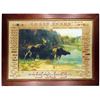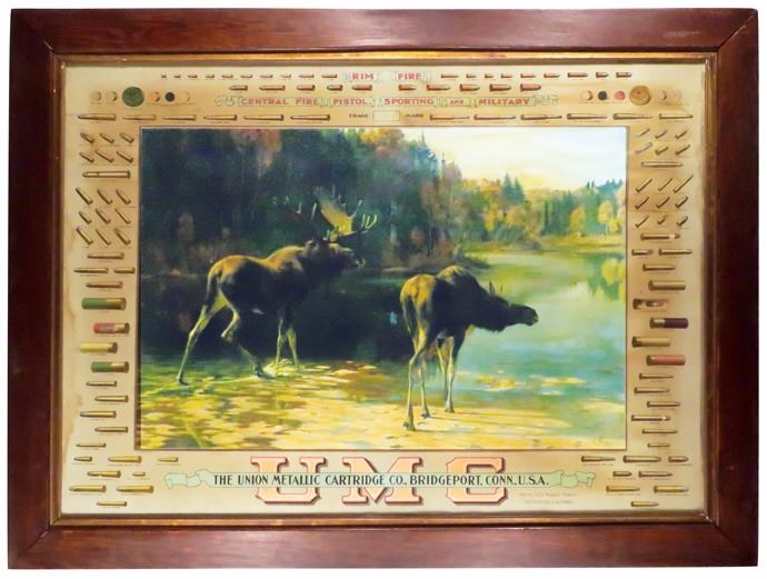 Rare Union Metalic Cartridge Bulletboard Original Lithograph, in original oak frame. Image of Moose by artist C. Rungius. Copyright 1899 by Union Mettalic Cartidge Co. Bridgeport, CT. Three small scratches bottom right and age darkening at top and right edge. 58 1/2 X 43 inches overall.