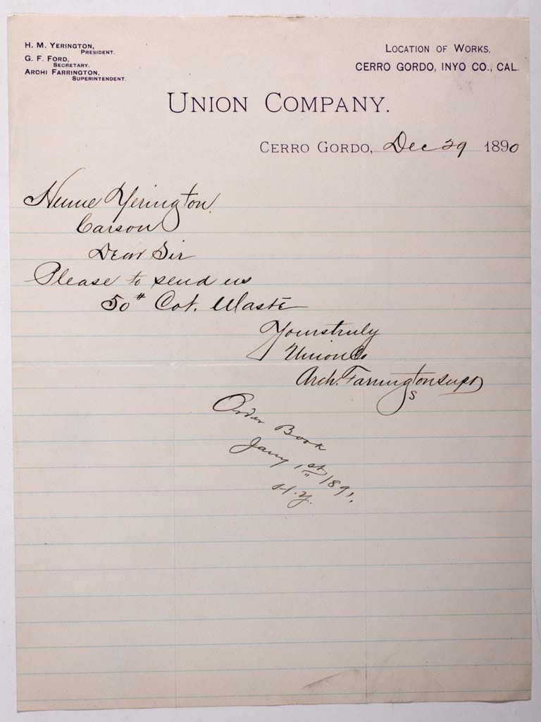 A note on UNION COMPANY stationery addressed to N YERINGTON of CARSON and signed by ARCHI FARRINGTON, superintendent. Dated 29 December 1890. Letter from Cerro Gordo in Inyo County, California.