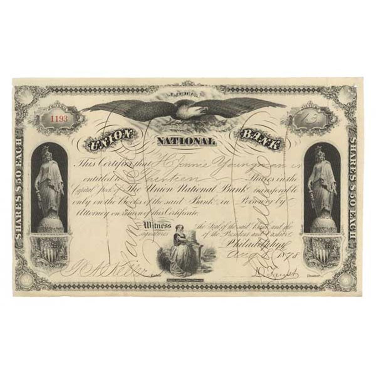 1878, Pennsylvania. Stock certificate for 13 shares. Black. Vignette of eagle at top center, female figure at bottom center and liberty figures at left and right. Pen cancelled. Very fine.