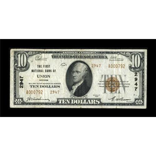 <B>Union, OR</B></I> - $10 1929 Ty. 2 <B>The First NB</B></I> Ch. # 2947<BR> An extremely scarce bank which is even harder to find in small size than large. This piece is one of only two Type 2 notes in the census, and the nicer of the pair at that. Nice <B>Very Fine.</B></I><BR><BR><b>Shipping:</b> Coins & Currency (<a target="_blank" href="http://www.heritageauctions.com/common/shipping.php">view shipping information</a>)