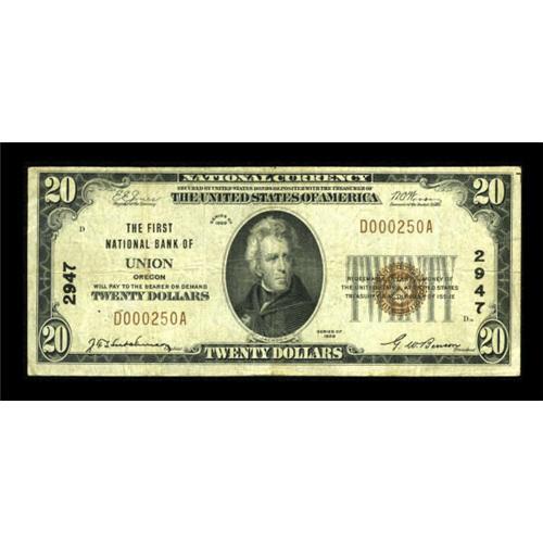 <B>Union, OR</B></I> - $20 1929 Ty. 1 <B>The First NB</B></I> Ch. # 2947<BR> A very scarce note from the only collectible bank in this small NE Oregon community. Notes from here are seldom offered, with the population of Series 1929 examples actually a tad below that of large size specimens.<B> Fine+.</B></I><BR><BR><b>Shipping:</b> Coins & Currency (<a target="_blank" href="http://www.heritageauctions.com/common/shipping.php">view shipping information</a>)