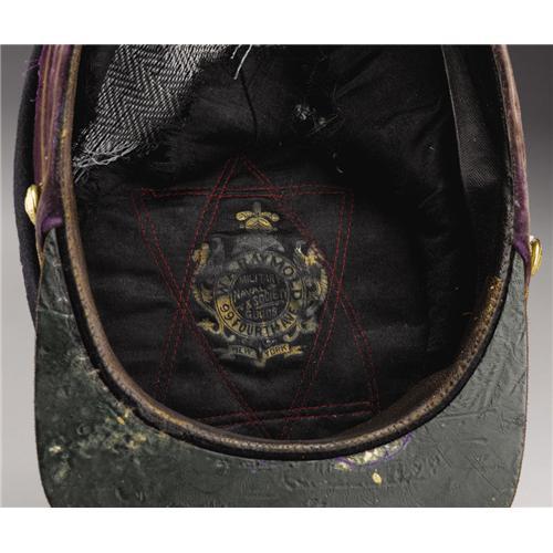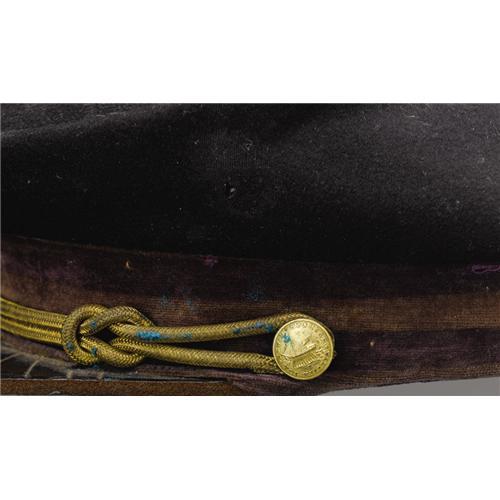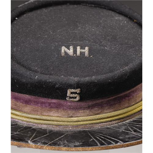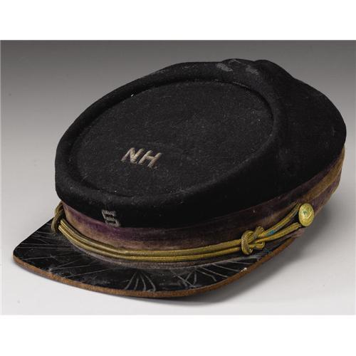 <B>Union Officer's Kepi of the 5th New Hampshire Volunteers - Gettysburg.</B></I> The dark blue kepi from the 5th New Hampshire Volunteer infantry, a unit that fought at Gettysburg, is in very good condition. With the "N.H." and the number "5" on the outside of the kepi in gold bullion thread, the cap is accented by the gold cord at the black leather visor secured by two beautiful New Hampshire buttons. The trim at the bottom of the blue wool cap is a gold felt band between two purple bands, giving this cap a distinctive appearance. <BR><BR>Inside the kepi is a 1¼” leather sweatband that is completely intact. The fine black silk lining bears the maker's mark of W. A. Raymold of New York City. The lining is torn at the back which reveals the quality construction of this kepi. This is a fine example of a Civil War kepi, a distinctive one in overall very good condition.<BR><BR><b>Shipping:</b> Miscellaneous Collectibles, Smal (<a target="_blank" href="http://www.heritageauctions.com/common/shipping.php">view shipping information</a>)