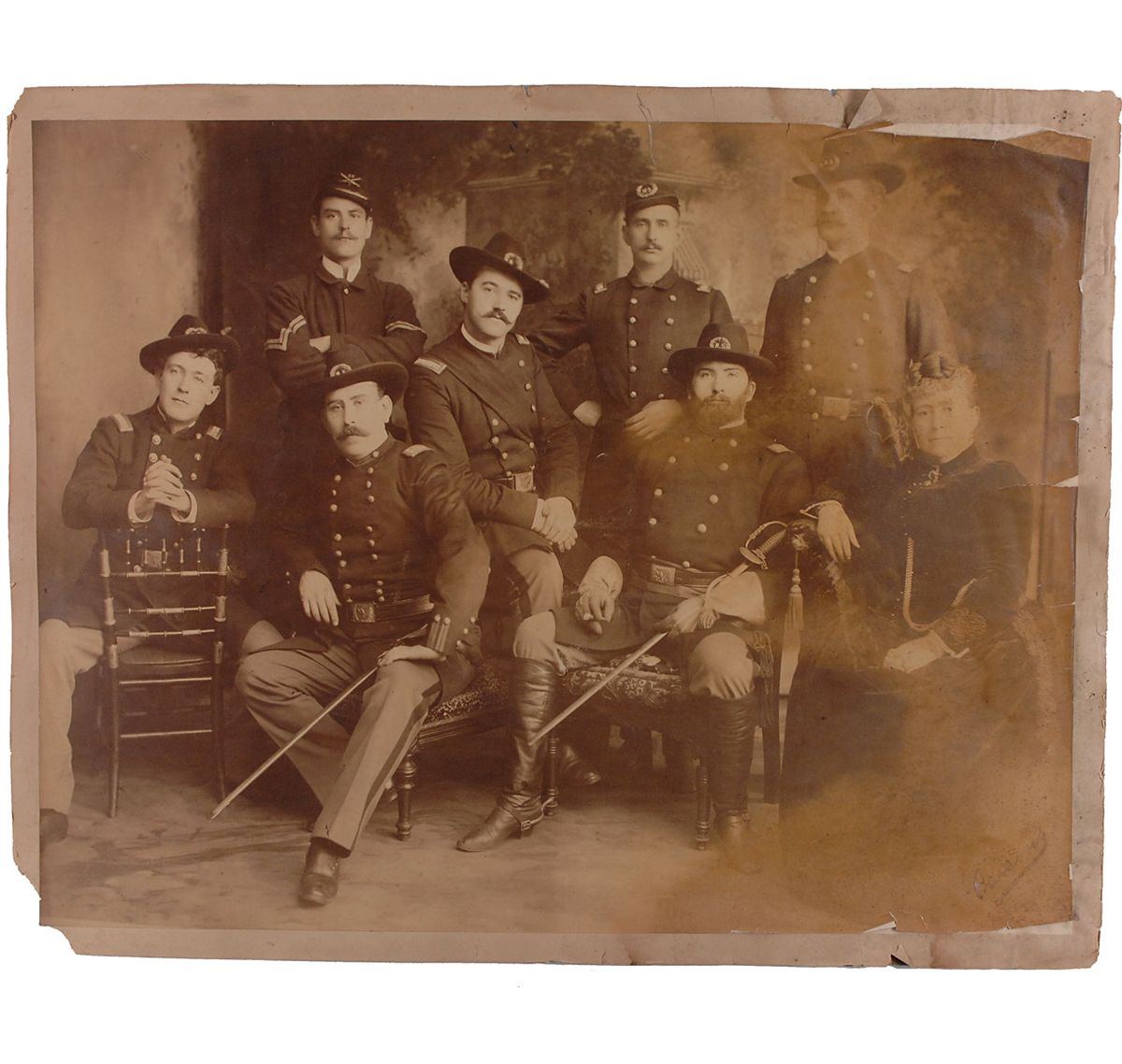 Rare original mammoth albumen studio portrait of seven Union soldiers with a woman, 22.5 x 17.5 affixed to a 24 x 19 mount, signed in the lower right by the photographer, “Parsons.” The men are in uniform, three holding their sabers, and visible hat pins include two “US,” two “MD,” and one with crossed sabers or rifles. In good to very good condition, with tears and staining to the right side of the photo, paper loss to lower left corner of the mount, and tears and separations to mount layers. The majority of the image is incredibly sharp, with superb clarity to even the smallest details of the uniforms, including belt buckles, hat pins, and jacket buttons. The photographic process of the mid-19th century made prints of this size quite expensive to produce and thus extremely scarce.