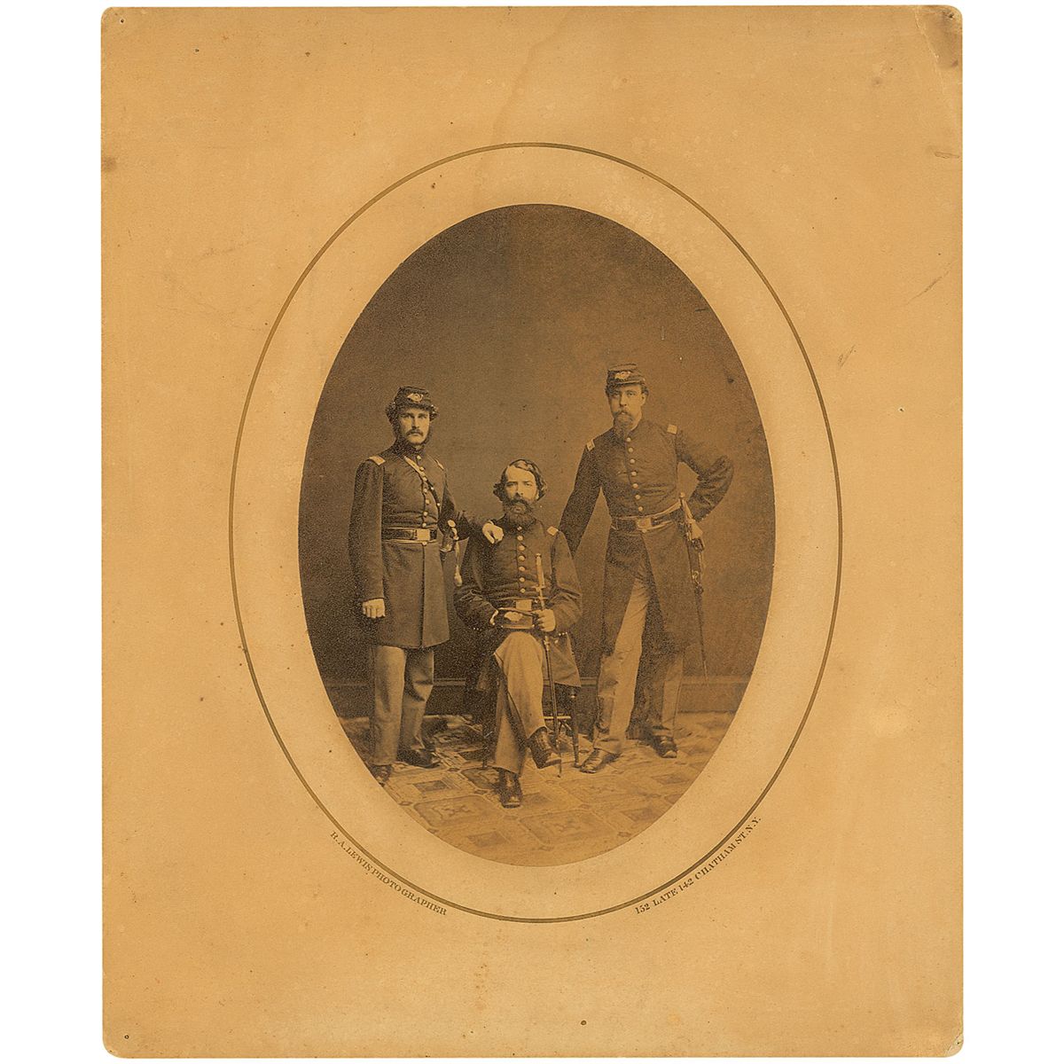 Exceptional and attractive oversized original 1860s albumen photograph of Union Officers by R. A. Lewis of New York. Oval print measures approximately 5.25 x 7.5 and is affixed to its original 9.75 by 12 mount. R. A. Lewis Photographers stamped below the image. Sharp and clean image with deep tones. The mount has general wear and aging. A rare large Civil War photograph that presents well.