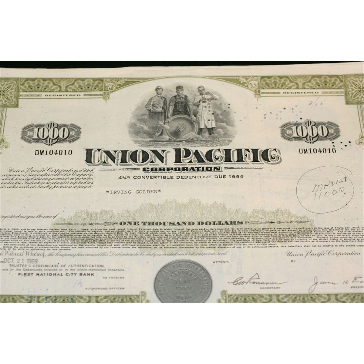Union Pacific Corp. Stock Certificate dated 1969