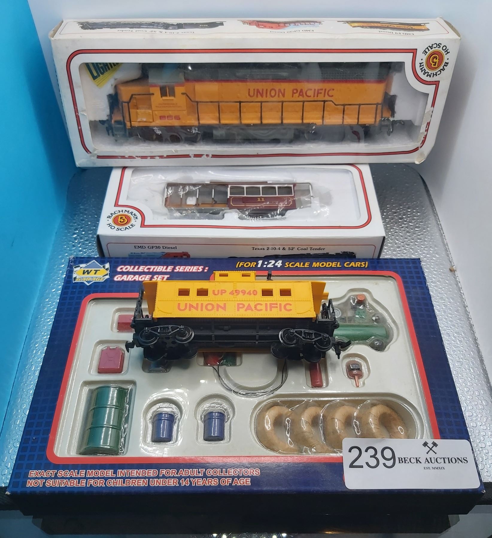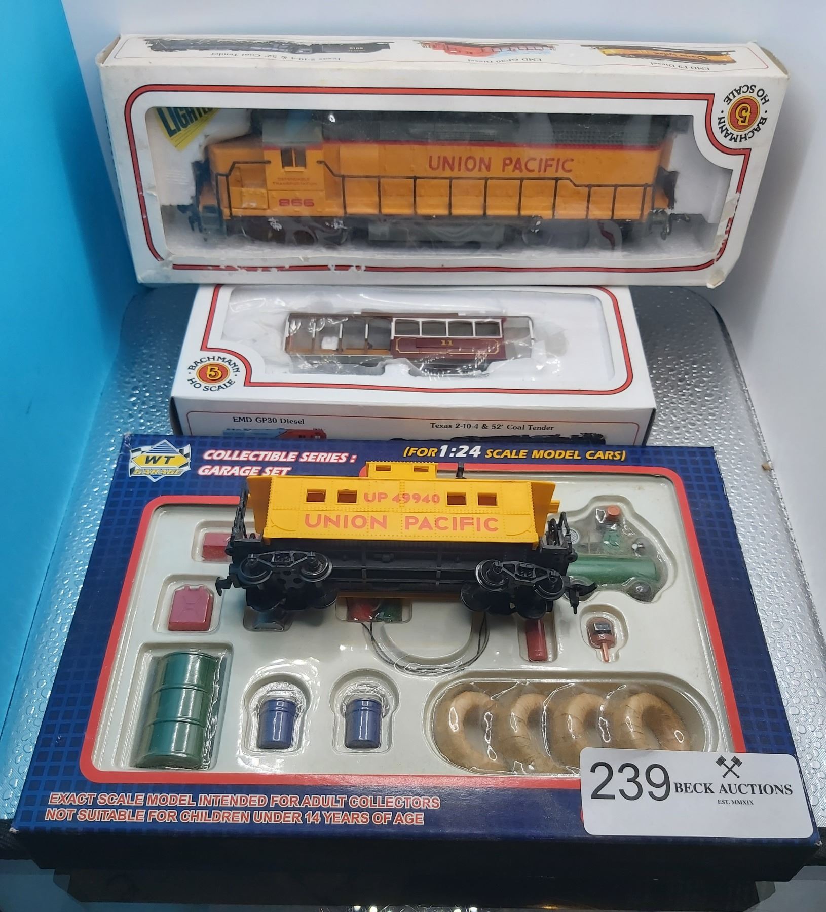 Union Pacific Locomotive Bachman HO Scale Plus Trolley Car Caboose and Garage Set