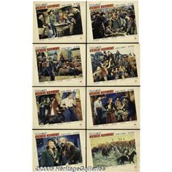 <B>Union Pacific (Paramount, 1939)</B></I> Lobby Card Set of 8 (11" X 14"). Union Pacific is Cecil B. DeMille's extravagant telling of the building of the intercontinental railroad. Barbara Stanwyck and Joel McCrea headline the all-star cast, including Akim Tamiroff, Robert Preston and Brian Donlevy. Overseer McCrea ramrods the construction of the rails, while protecting them from profiteer Donlevy. At the same time, he finds time to romance postmistress Stanwyck, who is featured on six of the eight cards. One card has been trimmed about a half inch on the right border. Several pinholes, slight stains, scratches, and edge wear. Paper loss on two cards. Fine. 8 items