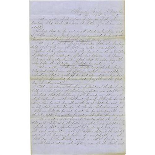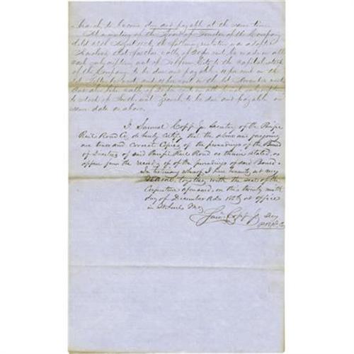 <B>Pacific Railroad Co. Resolutions Signed </B></I> "<I>Saml Copp, Jr. Secy/P.R.Rd Co.</B></I>," two pages, 8.25" x 13.25". Office of Pacific Railroad Co., St. Louis, December 29, 1856. Six early manuscript resolutions passed at six meetings of the Board of Directors of the Pacific Railroad Company from July 12, 1854 to August 13, 1856. Each concerns company stock. In part, "<I>Resolved that ten per cent on all stock subscribed west of Jefferson City is hereby called and required to be paid to the Treasurer on or before the 15th day of January 1854...Resolved that a further call of ten per cent on the subscription of stock for the construction of the road between Jefferson City and the western boundary of the State be made payable before the first day of September next...</B></I>" Further resolutions relate to subscribers on the Southwest Branch of the railroad. At the conclusion, secretary Samuel Copp, Jr. certifies "<I>that the above and foregoing are true and correct copies of the proceedings of the Board of Directors of said Pacific Rail Road as therein stated...</B></I>" The political and business leaders of St. Louis secured a Missouri charter in 1849 for the Pacific Railroad to extend "from St. Louis to the western boundary of Missouri and thence to the Pacific Ocean." On July 4, 1851, groundbreaking ceremonies for the railroad, a direct predecessor of the Missouri Pacific, were held at Buffalo Bayou, near Houston, Texas. In 1865, it became the first railroad to serve Kansas City on the western boundary of Missouri. It is today part of the Union Pacific Railroad, the largest railroad network in the United States. Light soiling at folds, otherwise near fine.<BR><BR><BR><b>Shipping:</b> Flat Material, Small (<a target="_blank" href="http://www.heritageauctions.com/common/shipping.php">view shipping information</a>)