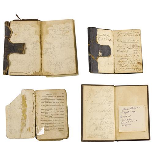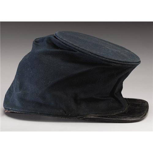 <B>Union Private Joab Bishop's “Bummer's Cap” of the 23rd Missouri, Photograph, Diary and Notebooks from the Civil War</B></I> Joab Bishop was born February 12, 1832 in Missouri and joined the 23rd Missouri Infantry of the Union Army on August 4, 1862. The 23rd Missouri would be battle hardened as they had seen action at the Battle of Shiloh before Bishop joined them. He would see his share of combat in the Atlanta Campaign, seeing service at Peachtree Creek. He died during the Siege of Atlanta on August 13, 1864, most likely wearing this cap.<BR><BR>This bummer's cap belonged to Private Bishop, sent home from the war along with the accompanying personal items shown here. Made of fine blue cloth, the cap is in overall good condition. This type of Union Army cap was used extensively during the Civil War but few have survived in this condition. There is a slight break in the stitching at the rear. The 1½” leather band is intact and still pliable. The leather visor shows no breaks or tears and the chinstrap of the cap is missing but the lining on the inside of the cap is in very good condition. The two small Federal eagle buttons have come off the cap but have been saved by the family along with two gold plated watch fobs and a buckle.<BR><BR>Accompanying this archive of Private Bishop is a ¼ plate ambrotype of Private Bishop in uniform. Seated for his portrait, Private Bishop is pictured in his Union private's uniform, the buttons of which have been hand-tinted by the photographer. His cheeks have also been tinted. The frame outlining the photograph is in good condition but the two-piece, leather frame has come apart at the binding.<BR><BR>Along with Private Bishop's bummer's cap and photograph, there are two handwritten journals and two books that were the property of the soldier. The first volume of the two books is a 3” x 4 ½” paper bound book of soldier's hymns and prayers in poor condition, but still held together by its string threading at the binding. Handwritten in pencil inside the rear cover are the words "<I>Joab Bishop, Co. D 23rd Mo.</B></I>."<BR><BR>The second book is a 3¼” x 5” <I>Constitution of the U. S., Declaration of Independence and Washington's Farewell Address,</B></I> linen bound with the title stamped in gold on the cover. Inside the rear cover is the inscription in ink, “Carondelet, St. Louis County, Missouri, March the 26th A. D. 1863, 23rd Reg. Mo Vol. Co. D.”, and an indication that he purchased the book on that date and at that place. The words are repeated inside the front cover by another hand in pencil prefaced by the words “Joab Bishop, his book…” This book was common to schoolhouses of the period and patriotic soldiers took many to war, symbolic of their devotion to the Union.<BR><BR>In the first of the two handwritten journals is a leather bound book approximately 3¼” x 5”. It is essentially a journal containing the genealogy of the Bishop family through the 1960's. Private Bishop's death is noted in 1864 and there is a notation that “his remains are at Atlanta, Georgia”. Bishop's marriages and births of children are also noted as well as what appears to be a household inventory.<BR><BR>The second handwritten journal is Private Bishop's wartime diary of his service with the 23rd Missouri Infantry. The small, leather 2½” x 4” soldier's diary is written in pencil and in ink and begins with his enlistment in 1862. He notes his travels with the regiment and gives accounts of the 'skirmishes' in which his unit takes part. Most frequently he writes of everything from throwing up breastworks, to driving cattle to turning in the soldiers' weapons for new ones. He also writes of battle, especially during the Atlanta Campaign where his last entry is on August 8, 1864 when he notes he “went to hosp.” (hospital) with the word 'hospital' underlined. Private Bishop would die five days later. At the rear of the diary, in reverse order and upside down, the Private had been making notations of the monies he had expended while in the service of the Union Army. Remarkably, he writes that on June 17, 1863 he purchased a hat for $1.99. His last purchase noted before he died was “near Atlanta, Georgia, July 13, 1864 - 2 shirts”.<BR><BR>Included with this archive is a handwritten letter from Private Joab Bishop to his wife Roda and son Stephen. Dated July 22, 1863 as Private Bishop was with his regiment in Rolla, Missouri, he writes of the news of the war he has read through the newspapers. He mentions his father, a preacher back home, and Bishop's belief that the war will be over soon since he has read of the fall of Vicksburg and of Confederate losses at Helena, Arkansas. He also mentions that “the Union men has run old Morgan down and captured nearly all his force”, referring to the capture of Confederate raider Brigadier General John Hunt Morgan's force just a few days earlier.<BR><BR>This is a remarkable archive of material on a Union soldier that not only includes Bishop's bummer's cap and photograph, but also his personal diary that give his accounts of the war.<BR><BR><b>Shipping:</b> Miscellaneous Collectibles, Smal (<a target="_blank" href="http://www.heritageauctions.com/common/shipping.php">view shipping information</a>)