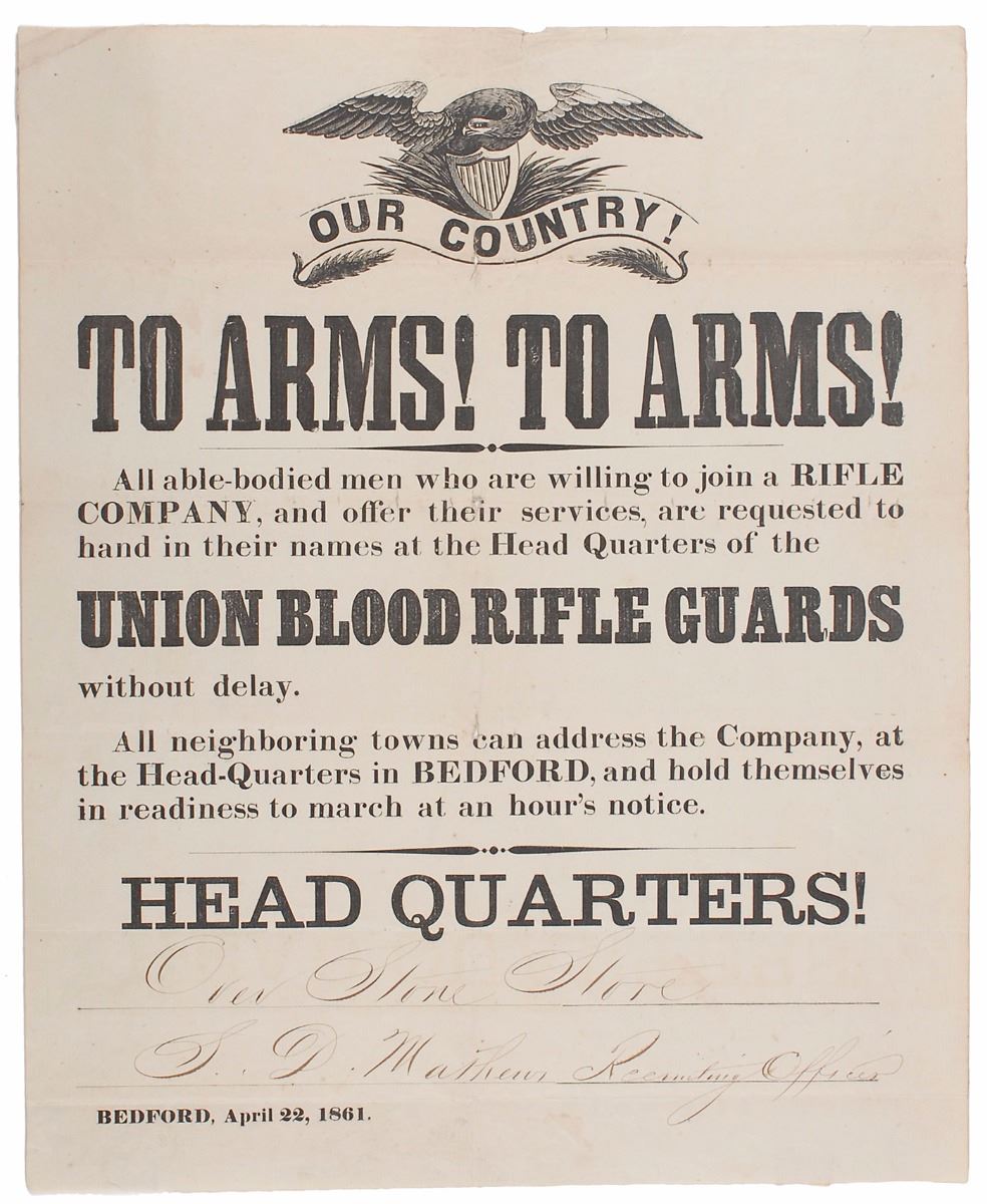 Interesting early printed recruitment broadside, 13.5 x 16.5, April 22, 1861, encouraging enlistment in a Union rifle company. The top features a handsome engraving of an eagle holding a banner reading, “Our Country!,” with large lettering below, “To Arms! To Arms!” The advertisement reads, in full: “All able-bodied men who are willing to join a Rifle Company, and offer their services, are requested to hand in their names at the Head Quarters of the Union Blood Rifle Guards without delay. All neighboring towns can address the Company, at the Head-Quarters in Bedford, and hold themselves in readiness to march at an hour’s notice.” The headquarters address is filled out in manuscript below, “Over Stone Store, S. D. Mathews Recruiting Officer.” Intersecting folds with small separations at intersections, and a few trivial tiny edge tears and creases, otherwise fine condition.
