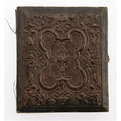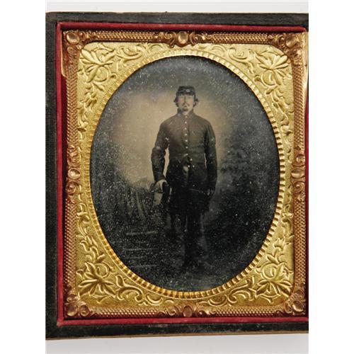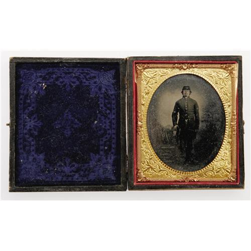 <B>Union Soldier 1/6th Plate Tintype.</B></I> This full standing portrait of a Union enlisted man is taken in front of a studio backdrop featuring tents amid a rugged landscape. The soldier is wearing a 9-button frock coat. His kepi sports insignia - possibly a corps badge - affixed to the chinstrap. Good surfaces, however dark haloing is present. Housed in a period case with the front lid separated. Overall very good condition.<BR><BR><b>Shipping:</b> Small Collectibles (<a target="_blank" href="http://www.heritageauctions.com/common/shipping.php">view shipping information</a>)